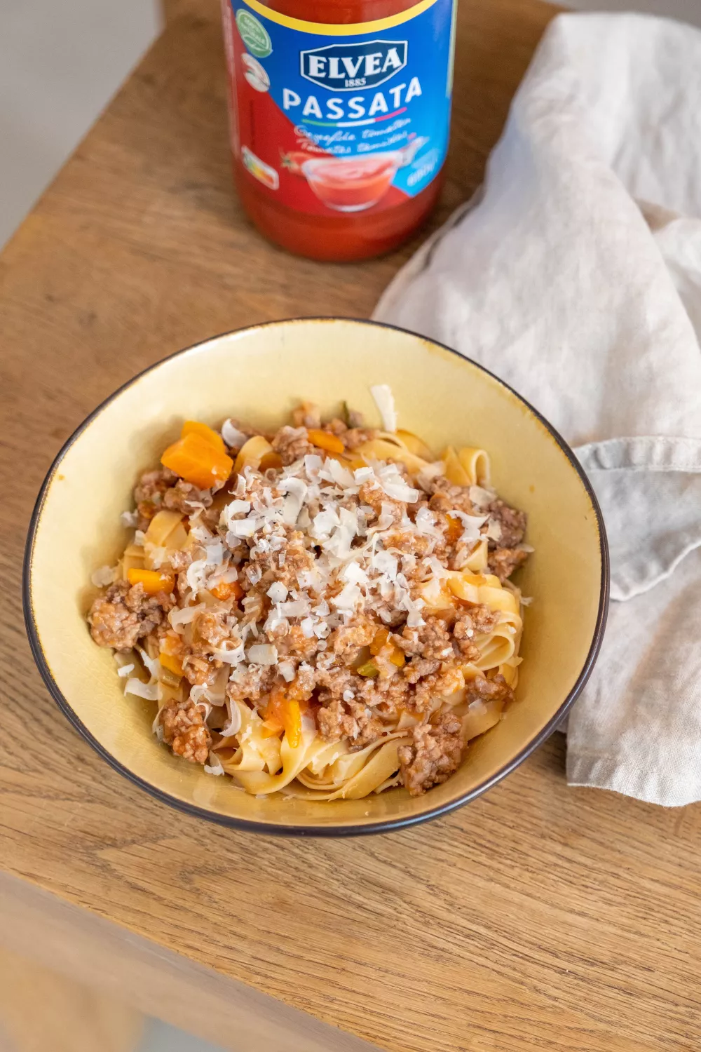 Deze klassieke tagliatelle al ragù bolognese combineert zacht gestoofd varkens-rundsgehakt met rijke passata, rode wijn en gesmoorde wortel, selder en prei voor volle, hartige smaken. De saus wordt rustig geblust en circa een uur zachtjes geprutteld zodat kruiden als salie, tijm en rozemarijn goed intrekken. Perfect comfort food voor een gezellig familiediner op herfstige of winterse avonden.