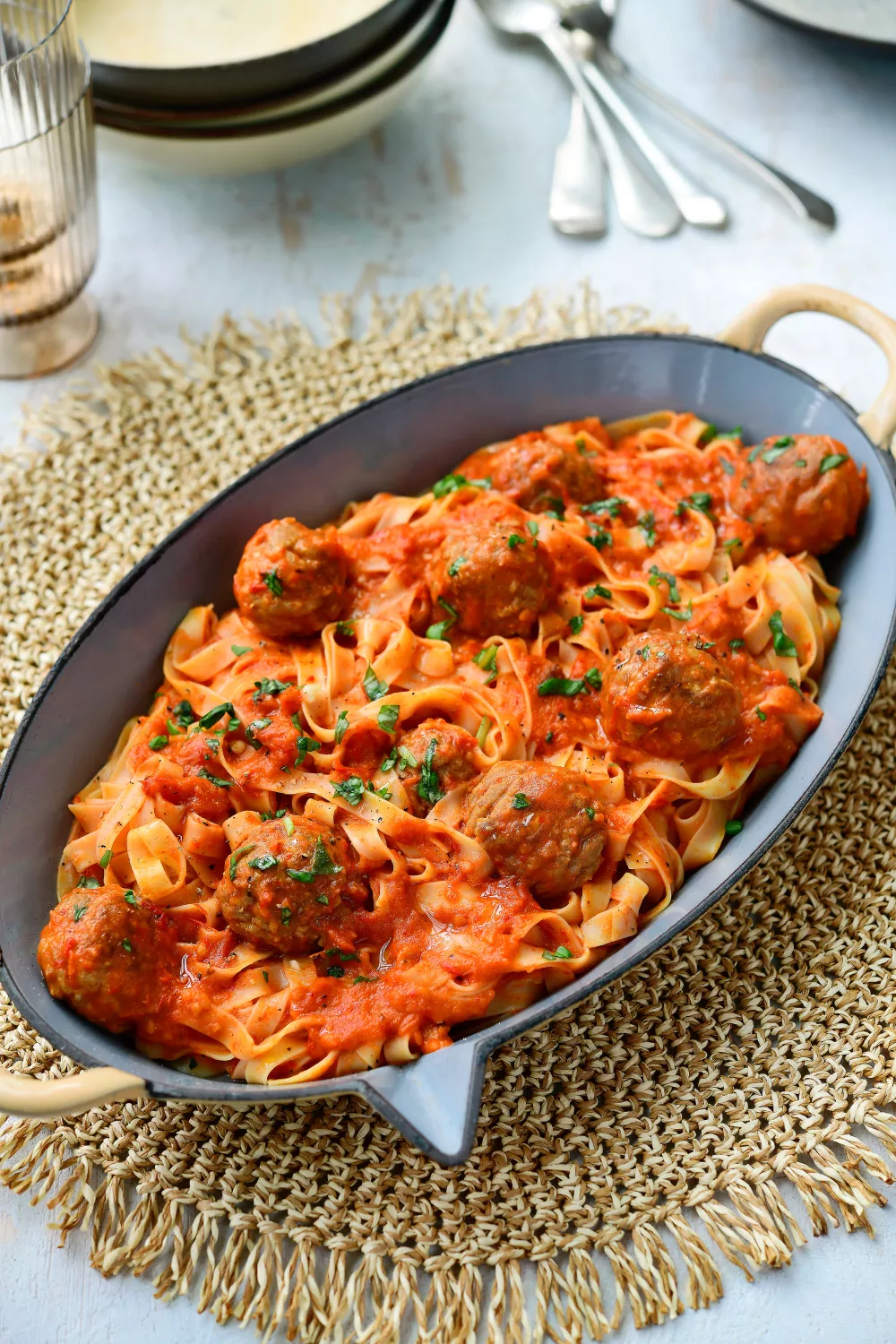 Tagliatelle met gehaktballetjes in een tomaat-paprikasausje