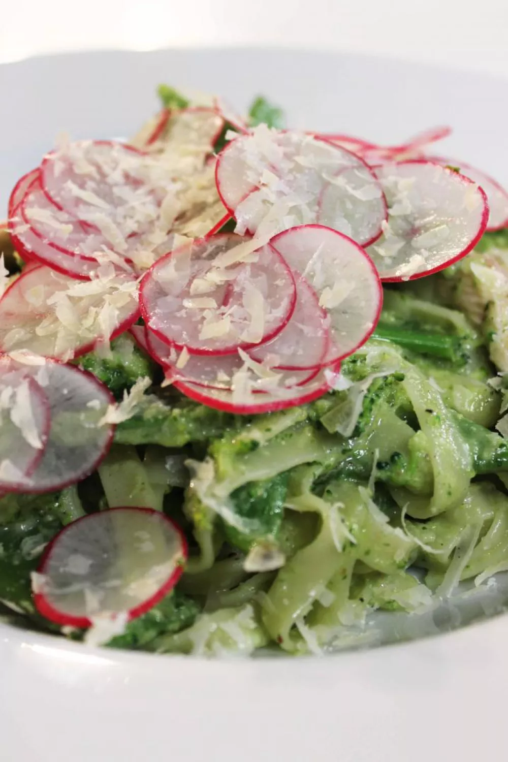Schep de pasta in een diep bord. Leg de plakjes radijs er mooi bovenop. Rasp er net voor het serveren nog wat Parmezaanse kaas over.