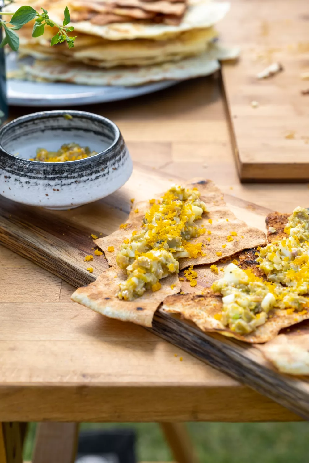 Warm het dunne, krokante brood kort op op de barbecue. Breek het vervolgens in stukjes en beleg met de tapenade.