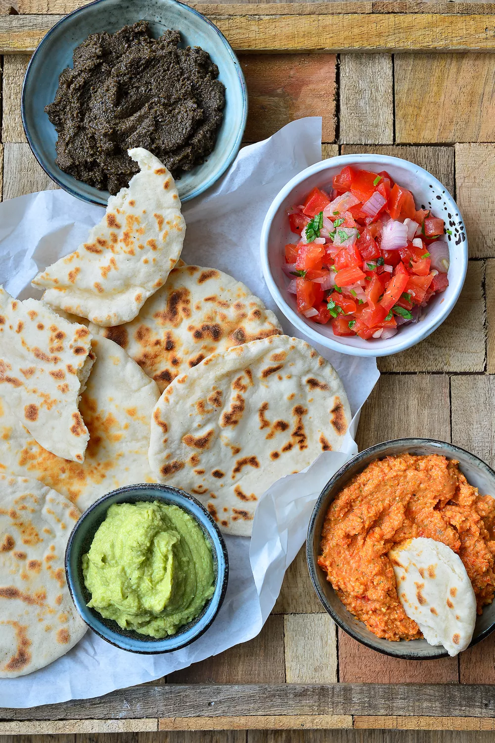 Serveer met pitabrooden tapenade van olijven, avocadohummusen tomatensalsa.