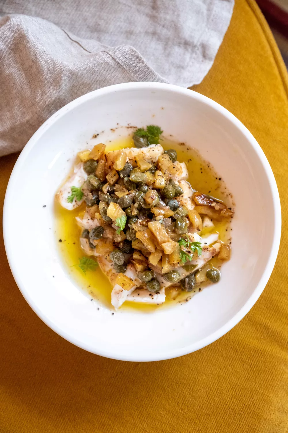 Zachte tarbotfilet met knapperige blokjes tamme kastanje, subtiele sjalot en zilte kappertjes in een licht gebruinde botersaus vormt een verfijnd visgerecht dat ideaal is voor een herfstig diner of feestelijke maaltijd. De vis wordt in zijn geheel in boter gebakken zodat het vlees vol en mals blijft. Na het verwijderen van het vel snijd je de tarbot in plakjes en werk je af met het aromatische botersausje.