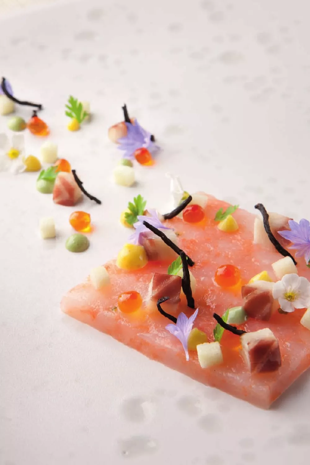 Plaats de tartaar van langoustines in een vierkante dresseervorm en strijk mooi strak. Beleg met blokjes gerookte paling, zalmeitjes, blokjes zure appel, crème van avocado, de hijiki, kerriemayonaise, blaadjes koriander, rasp van limoen en fleur de sel. Serveer de vinaigrette apart.