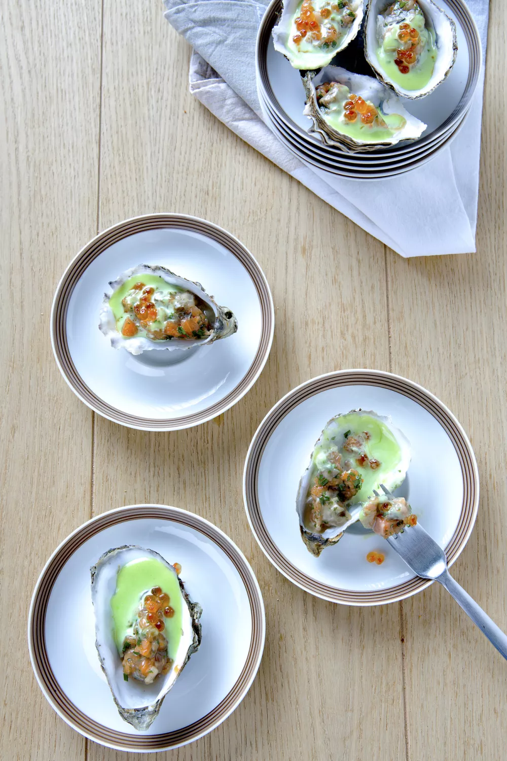 Vul de oesterschelpen met de tartaar. Werk af met de zalmeitjes.