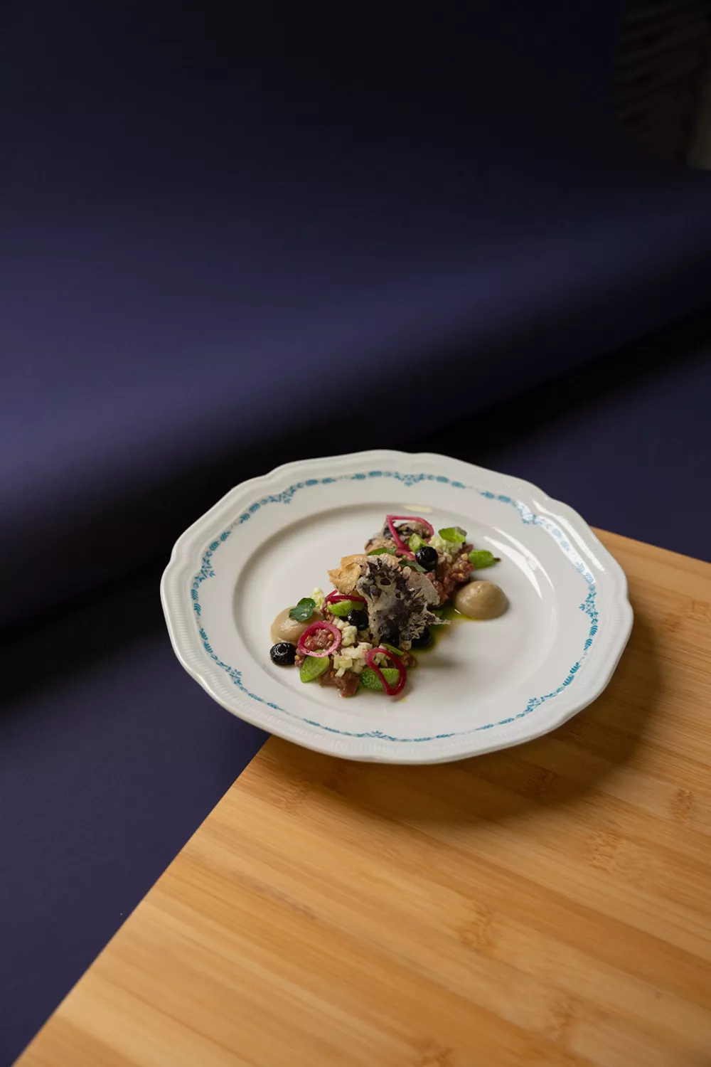 Een verfijnde tartaar van onglet met krokante tempura van aubergine, frisse shizo en gepekelde muizenmeloen combineert umami van het rauwe rundvlees met knapperige texturen en frisse zuren. Zwarte look puree en gepofte boekweit zorgen voor diepe smaak en bite. Perfect als feestelijk voor- of hoofdgerecht tijdens lente en zomer.