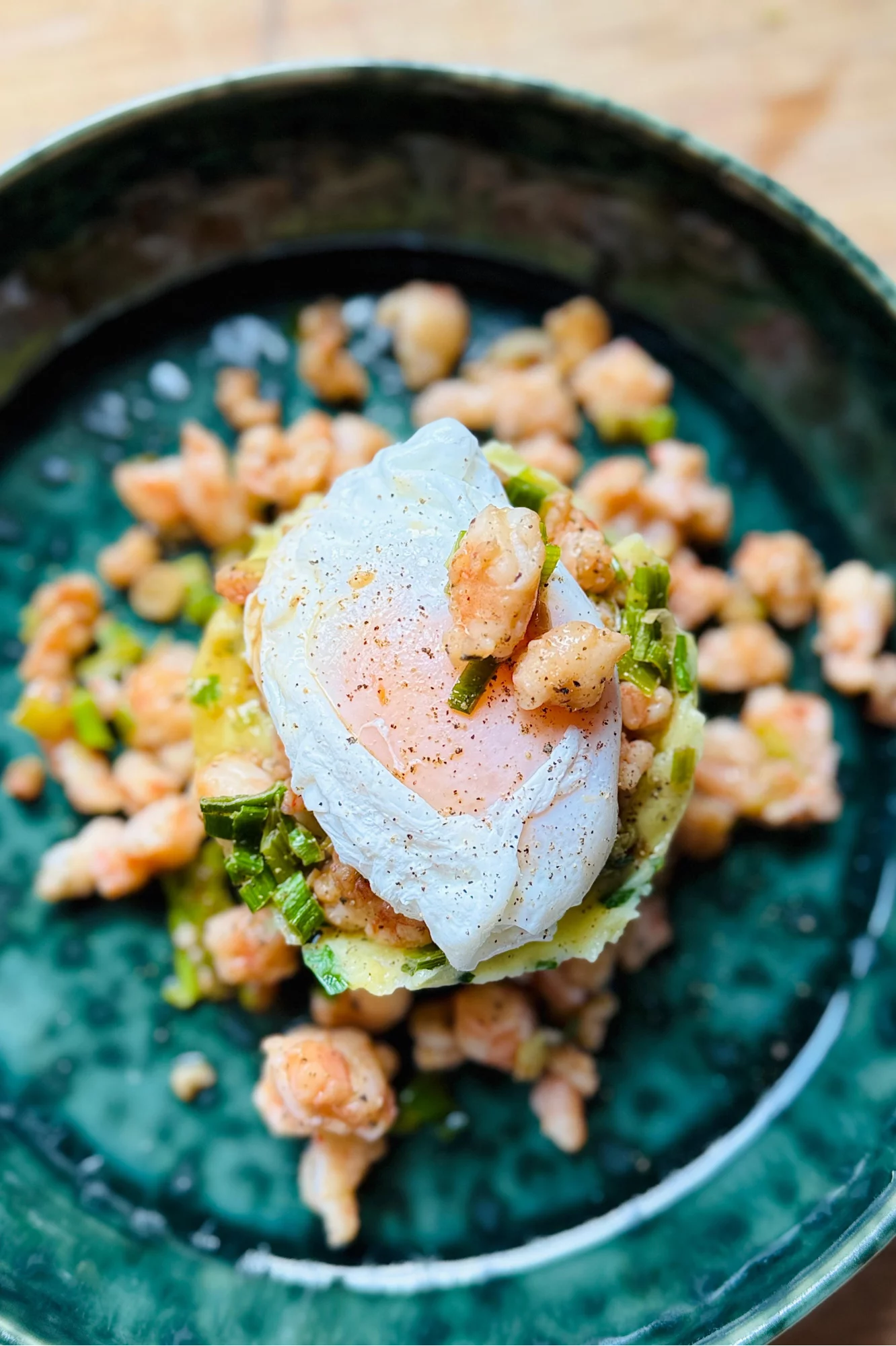 Verhit een beetje olie of boter in een pan op middelhoog vuur. Bak de fijn gesneden scampi’s kort samen met de lente-ui (±2-3 min) tot ze net gaar zijn. Laat afkoelen tot kamertemperatuur; dit voorkomt dat het ei bij het serveren gaat stollen.