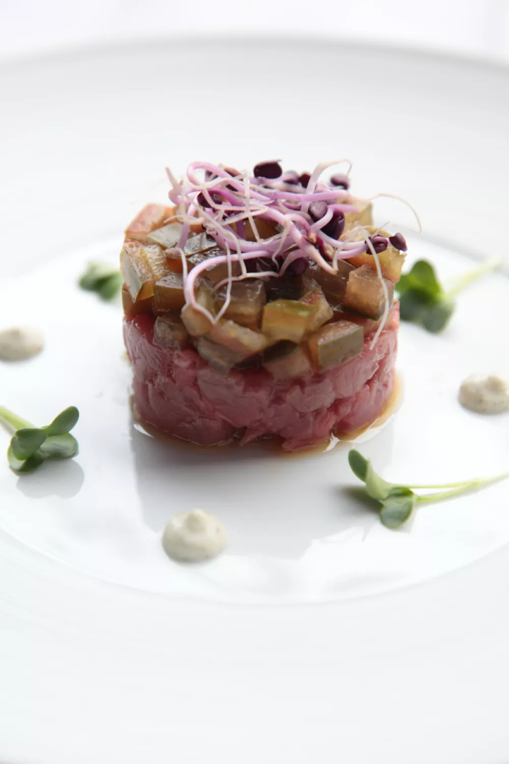 Leg wat scheutjes op de tartaar en werk het bord af met enkele blaadjes daikonkers.