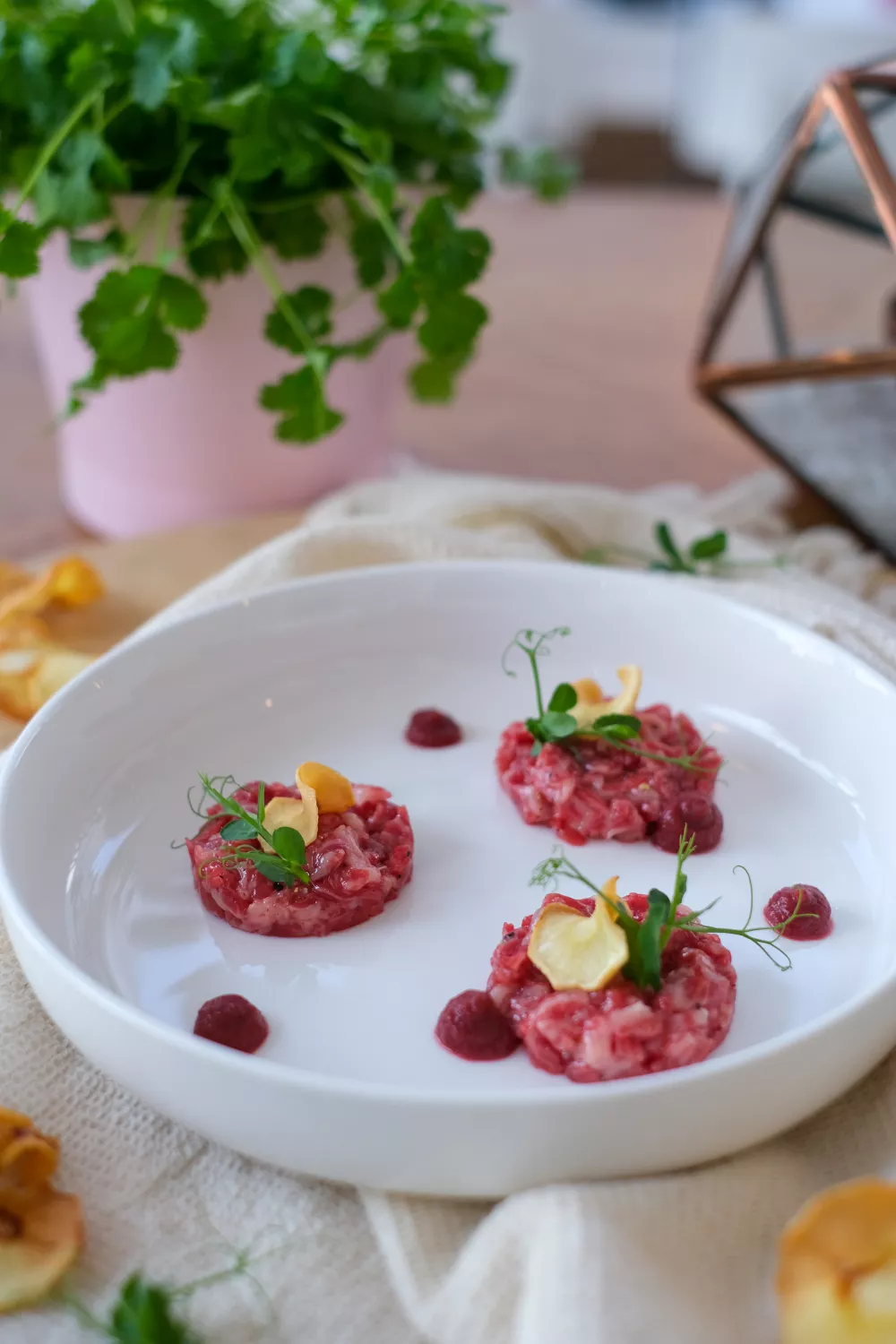 Maak met een kleine dresseerring drie mooie torentjes van de tartaar op een bord. Spuit er enkele toefjes van de crème van rode biet naast. Werk af met de chips van pastinaak en een takje groen.