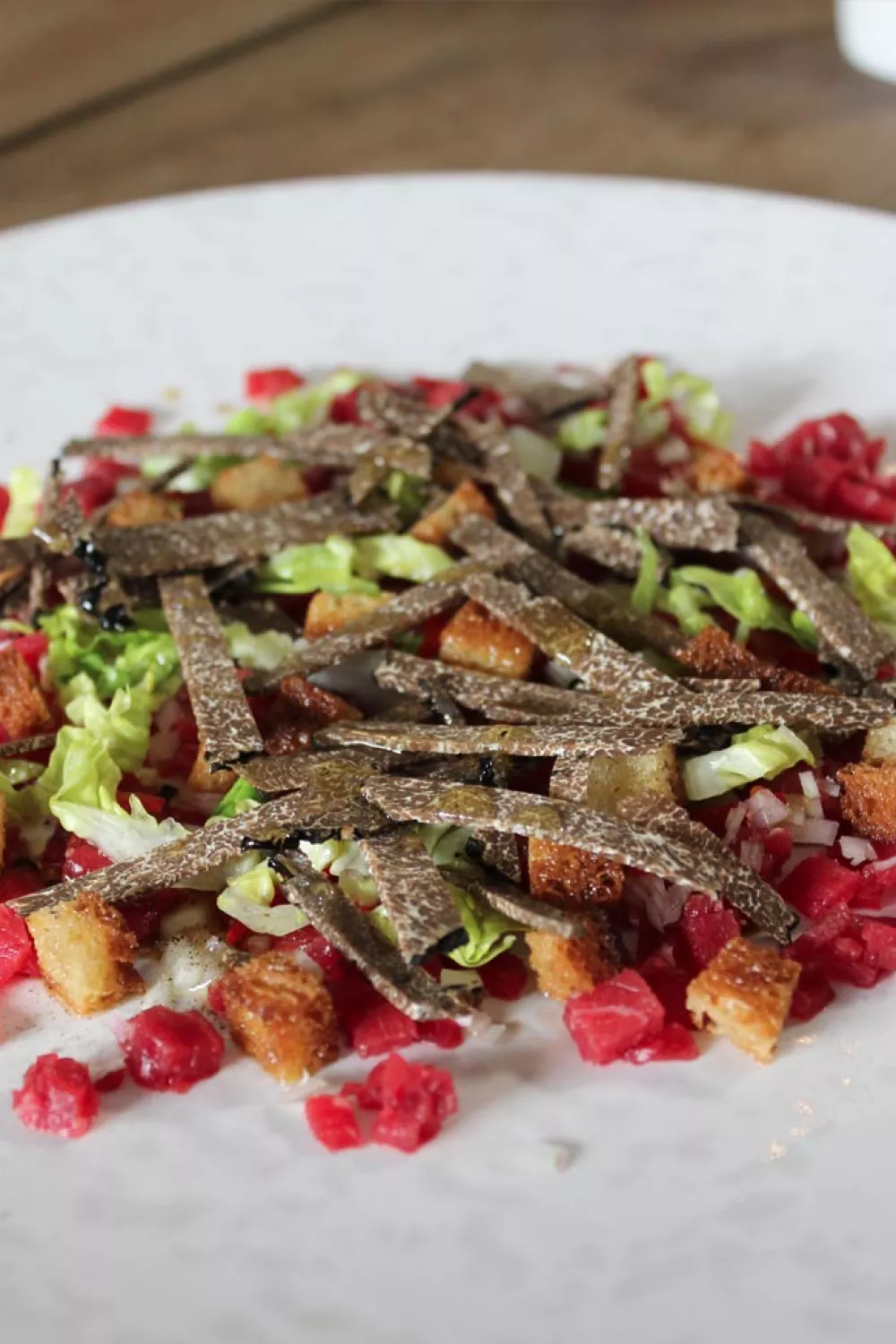 Zachte tartaar van West-Vlaams rood rund met herfsttruffel en knapperige broodcroutons vormt een verfijnde starter voor een feestelijk diner. Fijn gesneden rundsvlees krijgt balans van sjalot, zoetzuur opgelegde rode peper, sojasaus, olijfolie en fleur de sel. Afgewerkt met slahart en dun geschaafde truffel voor pure, seizoensgebonden smaak.