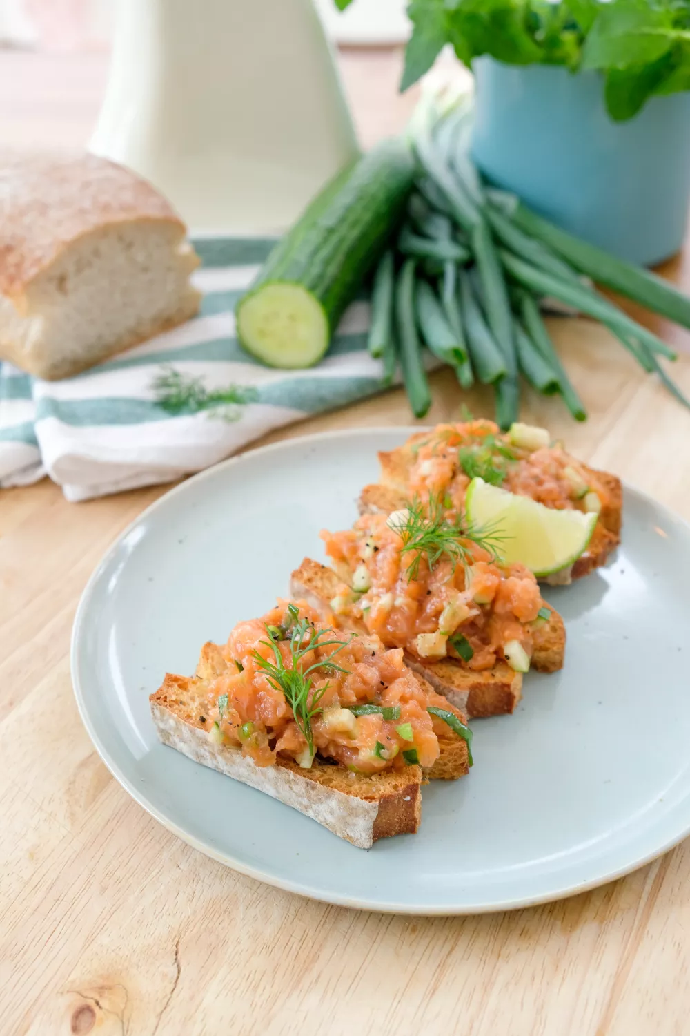 Krokante ciabattatoastjes, in de oven gebakken, worden belegd met frisse zalmtartaar van fijngemalen verse zalm, limoen en sojasaus voor een verfijnde smaakbalans. Knapperige komkommer, groene appel en fijngehakte lente-ui geven textuur en frisheid, en dille zorgt voor een aromatische afwerking. Ideaal als zomers voorgerecht of feestelijk borrelhapje wanneer je iets lichts en smaakvols wilt serveren.