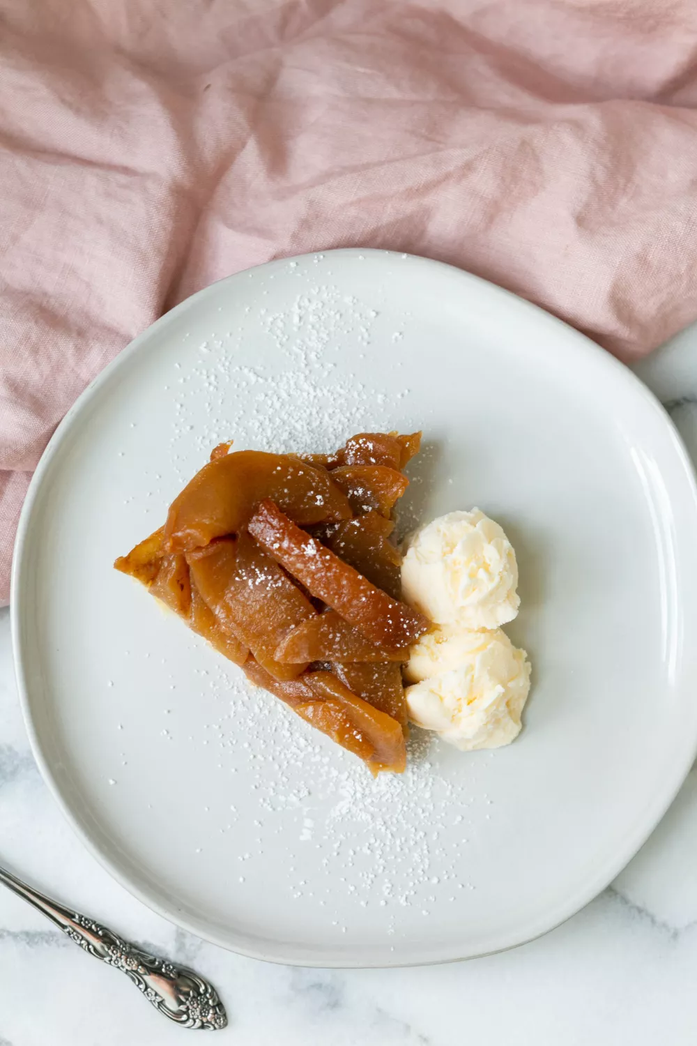 Tip:Indien je na het bakken merkt dat er redelijk veel jus uit de appels is gekomen, kan je dit best in een sauspan of steelpan afgieten alvorens de taart om te draaien. Kook het vocht in tot stroopdikte en giet dit over de tarte tatin.