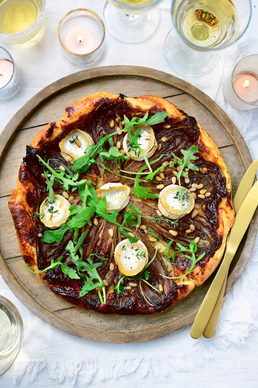 Deze hartige tarte tatin met witloof en zachte geitenkaas combineert krokant bladerdeeg met gekaramelliseerde honing en aromatische tijm voor een warm herfstgerecht. Het witloof wordt kort gebakken in boter en honing en onder het deeg in de oven gekaramelliseerd; na het omkeren werk je af met pijnboompitten en rucola. Perfect als elegant vegetarisch voorgerecht of verrassende lunch bij vrienden.