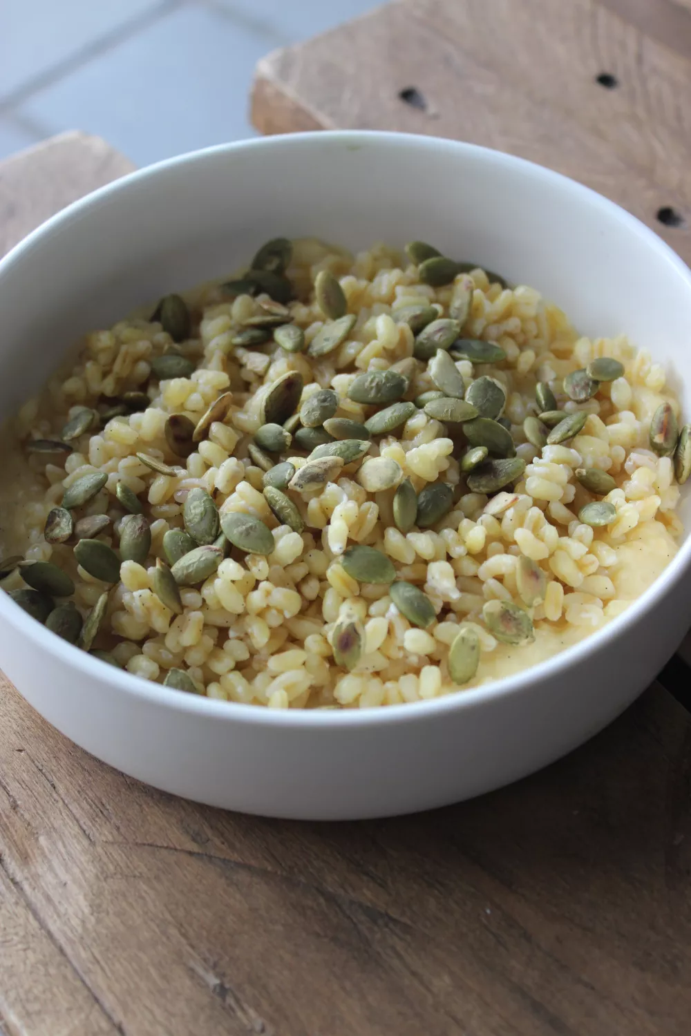 Schep de crème patissiere in een kommetje en bestrooi met een flinke laag tarwekorrels. Werk voor extra crunch af met de geroosterde pompoenpitten.