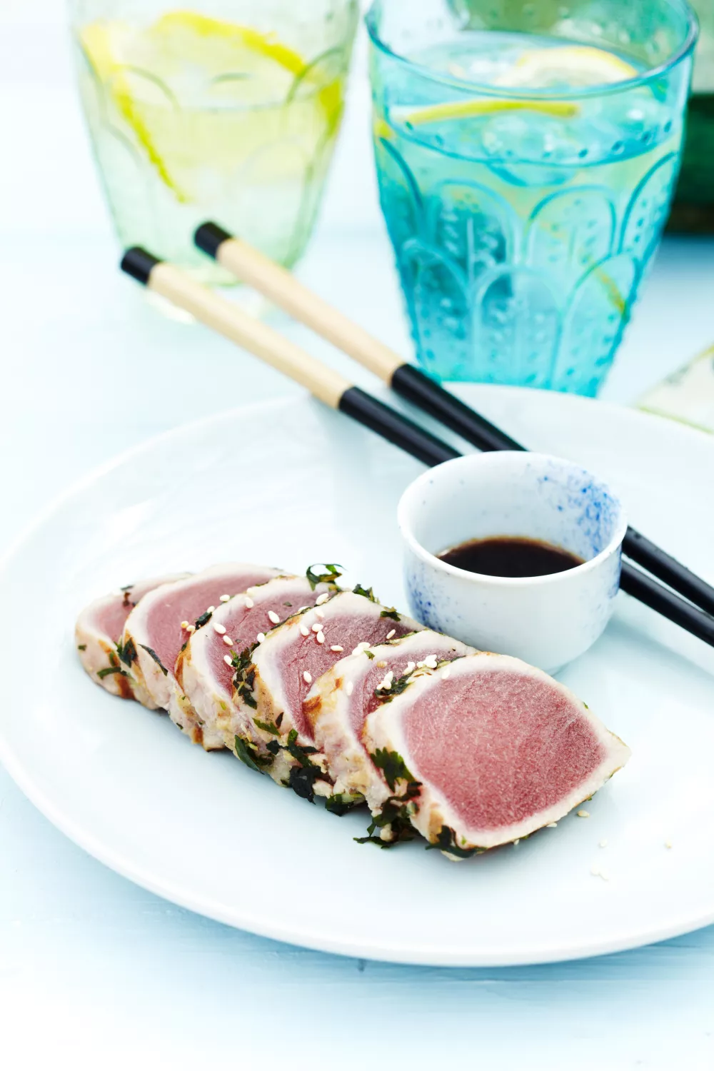 Snij vlak voor het serveren de tonijn in mooie plakken en bestrooi met de geroosterde sesamzaadjes. Geef de vinaigrette er apart bij.