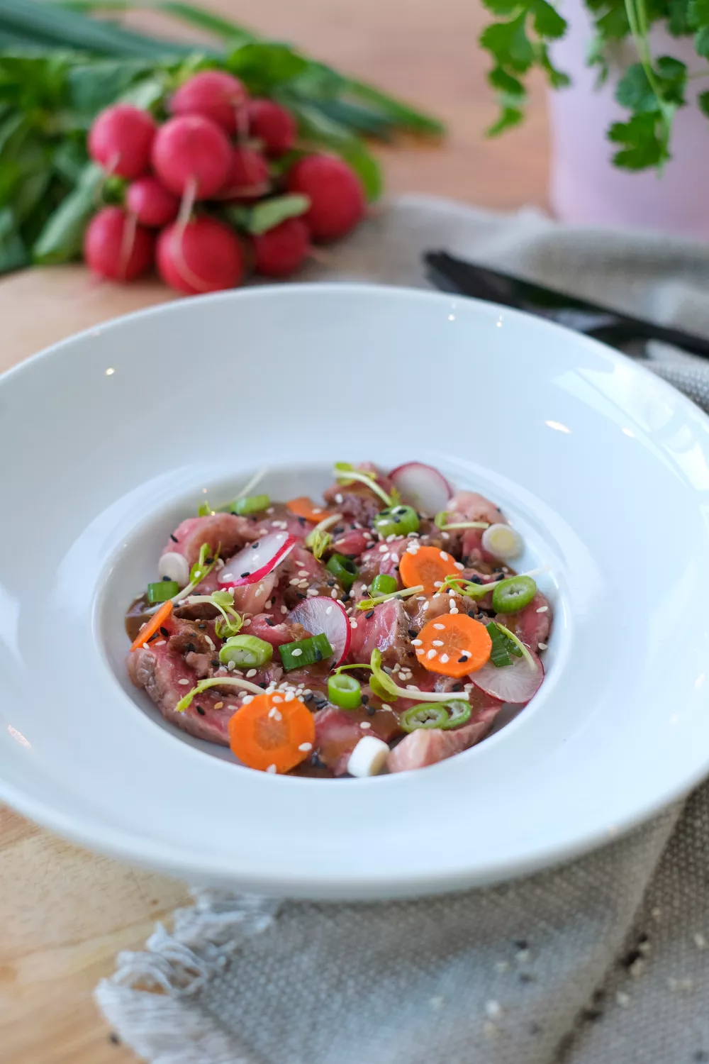 Een verfijnde tataki van Wagyu met romige misodressing en knapperige radijsjes, wortel en lente ui is een ideaal feestelijk voorgerecht of elegant borrelhapje. Het vlees wordt kort en heet geschroeid zodat het vanbinnen boterzacht blijft en vervolgens in flinterdunne plakjes geserveerd. Sushiazijn, sojasaus en sesamzaadjes geven frisse umami en textuur, perfect voor zomerse diners en speciale gelegenheden.