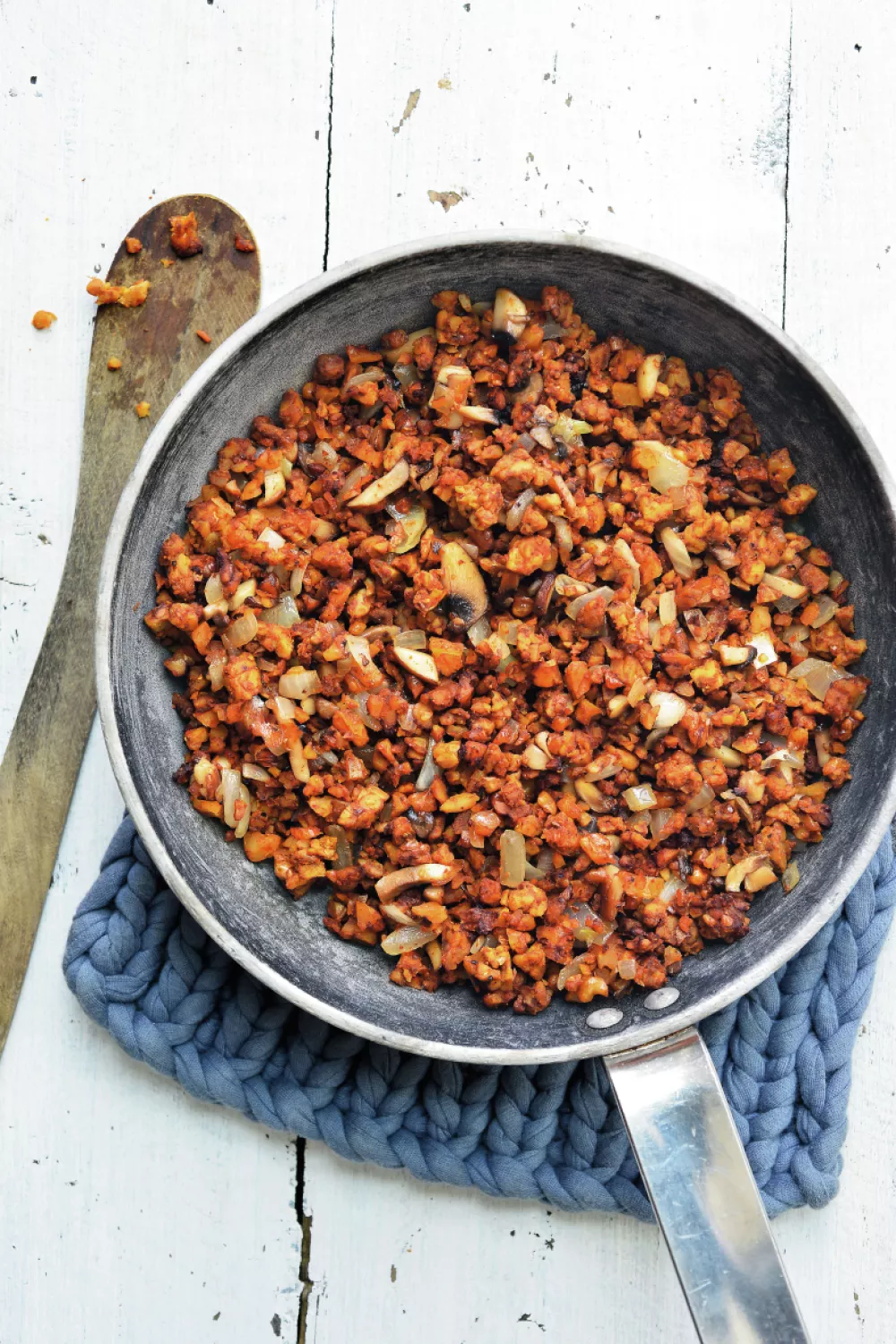 Knapperig en hartig tempehgehakt met walnoten of pecannoten en umami rijke champignons, ideaal als plantaardige vulling voor taco's, pastasauzen of ovenschotels. Je maakt het door tempeh en noten heel fijn te hakken, te mengen met tomatenconcentraat en sojasaus en kort in de oven te bakken, vervolgens meng je dit met fijngestoofde ui, knoflook en champignons. Geschikt voor doordeweekse diners en maaltijdprep, een warm eiwitrijk alternatief voor gehakt in elk seizoen.