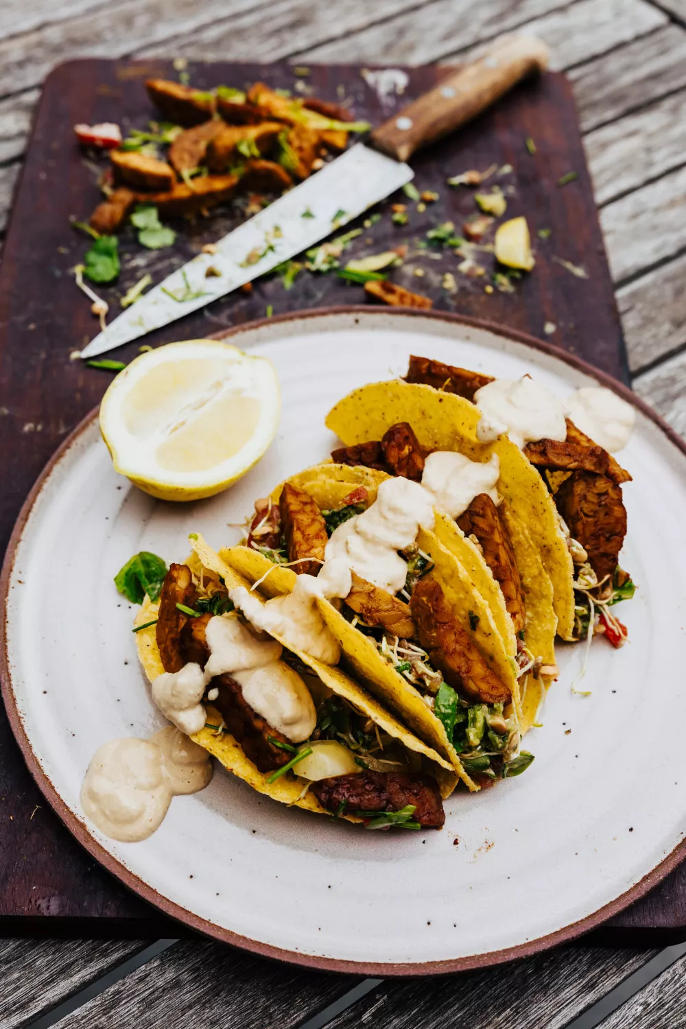 Haal de tacoschelpjes uit de oven en serveer met de salsa, tempeh en cashewcrème.