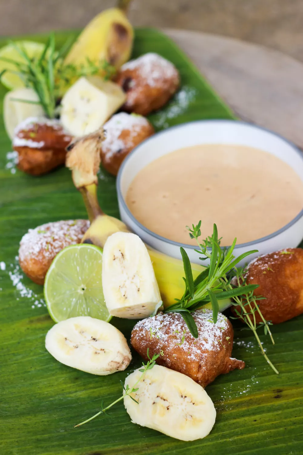 Een krokante tempura van banaan met een zijdezachte sabayon op basis van dessertwijn en Paschka banana is een speels en feestelijk dessert voor lente en zomer. Mini banaantjes worden door een licht beslag van bloem en zetmeel gehaald en kort gefrituurd tot goudbruin, terwijl de sabayon met eigelen, suiker, limoen en citroensap op zacht vuur tot binding wordt geklopt. Bestrooi met poedersuiker en serveer als elegant nagerecht bij een diner of als verwenmoment.