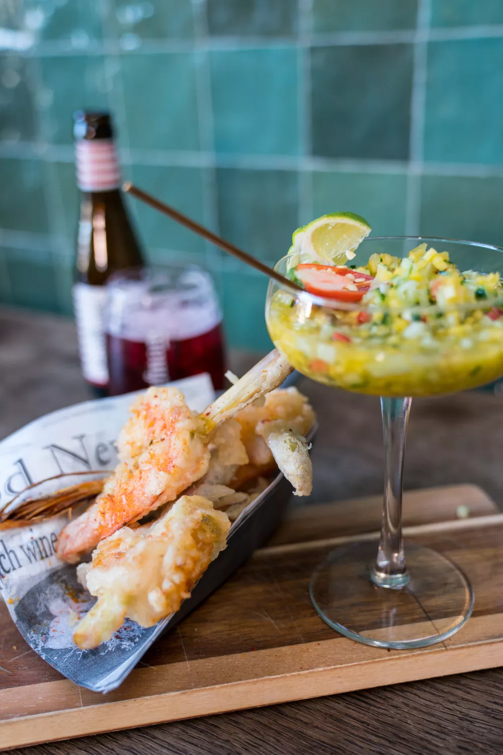 Schep de rellish in een mooi glas en serveer ernaast de tempura van tijgergarnaal.