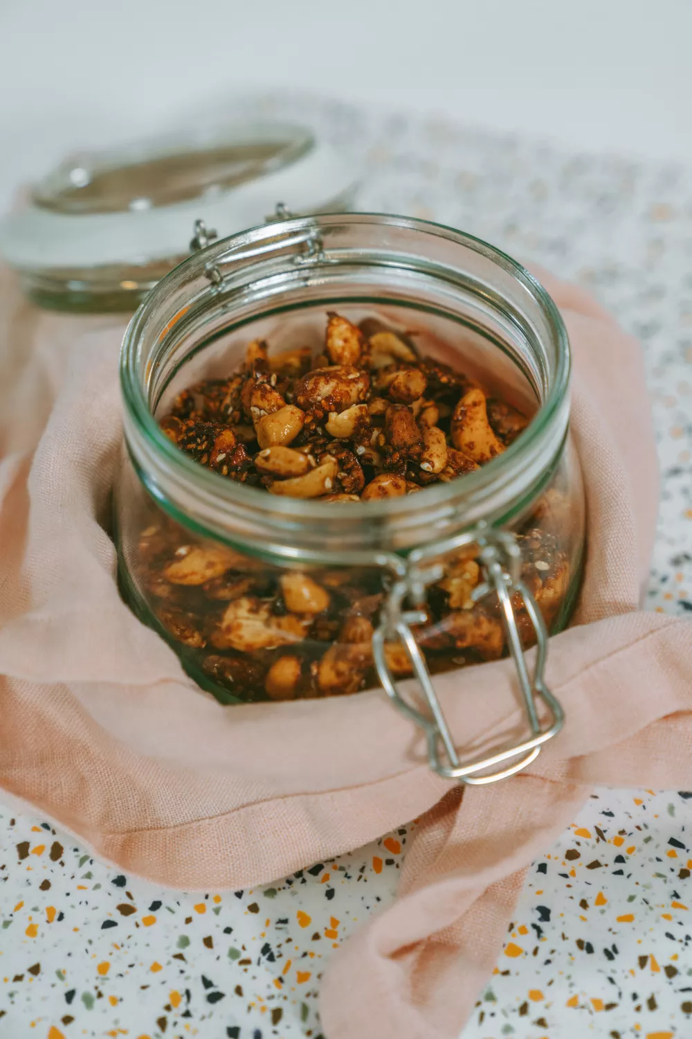 Knapperige teriyaki notenmix met cashewnoten, amandelen en pinda's, glanzend van Kikkoman sojasaus en agavesiroop en verrijkt met sesamzaad, gerookt paprikapoeder en een snufje cayenne. In de oven licht geroosterd tot ze mooi karamelliseren voor een hartig zoete snack met Aziatische touch. Perfect als borrelhap of aperitief en heerlijk bij herfstige avonden.