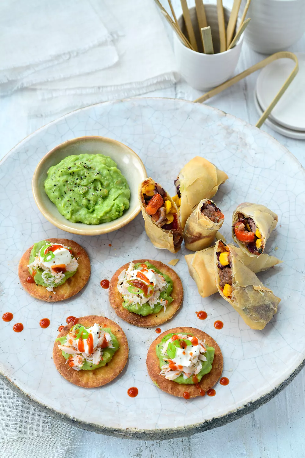 Frituur de tex-mexrolletjes 4 à 5 minuten op 180 graden, tot ze mooi goudbruin zijn (of bak ze 15 minuten in de oven op 200 graden) en serveer ze vervolgens met de resterende avocadocrème van de tostada’s.