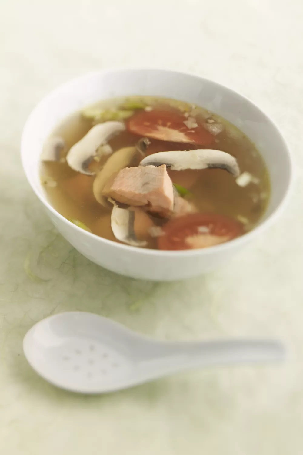Deze lichte Thaise vissoep combineert frisse limoen, aromatisch citroengras en pittige chili met umami van vissaus en champignons. De bouillon wordt zachtjes getrokken zodat de smaken intrekken en de zalm kort wordt gepocheerd tot hij fluweelzacht is. Perfect als verfijnd voorgerecht of lichte avondmaaltijd bij lenteachtige of frisse herfstige avonden.