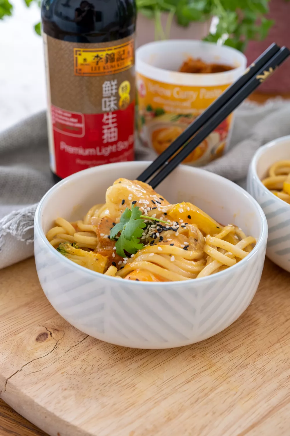 Fruit de ui en de look aan in een scheutje sesamolie. Voeg vervolgens de wokgroenten toe en roerbak ze enkele minuten. Doe dan de kokosmelk, de gele currypasta en de sojasaus er bij. Breng het geheel aan de kook en voeg de tijgergarnalen toe. Laat enkele minuutjes doorkoken zodat de tijgergarnalen mooi garen. Meng als laatste de noedels nog onder de curry en verdeel vervolgens over verschillende bordjes. Werk af met sesamzaadjes en koriander.