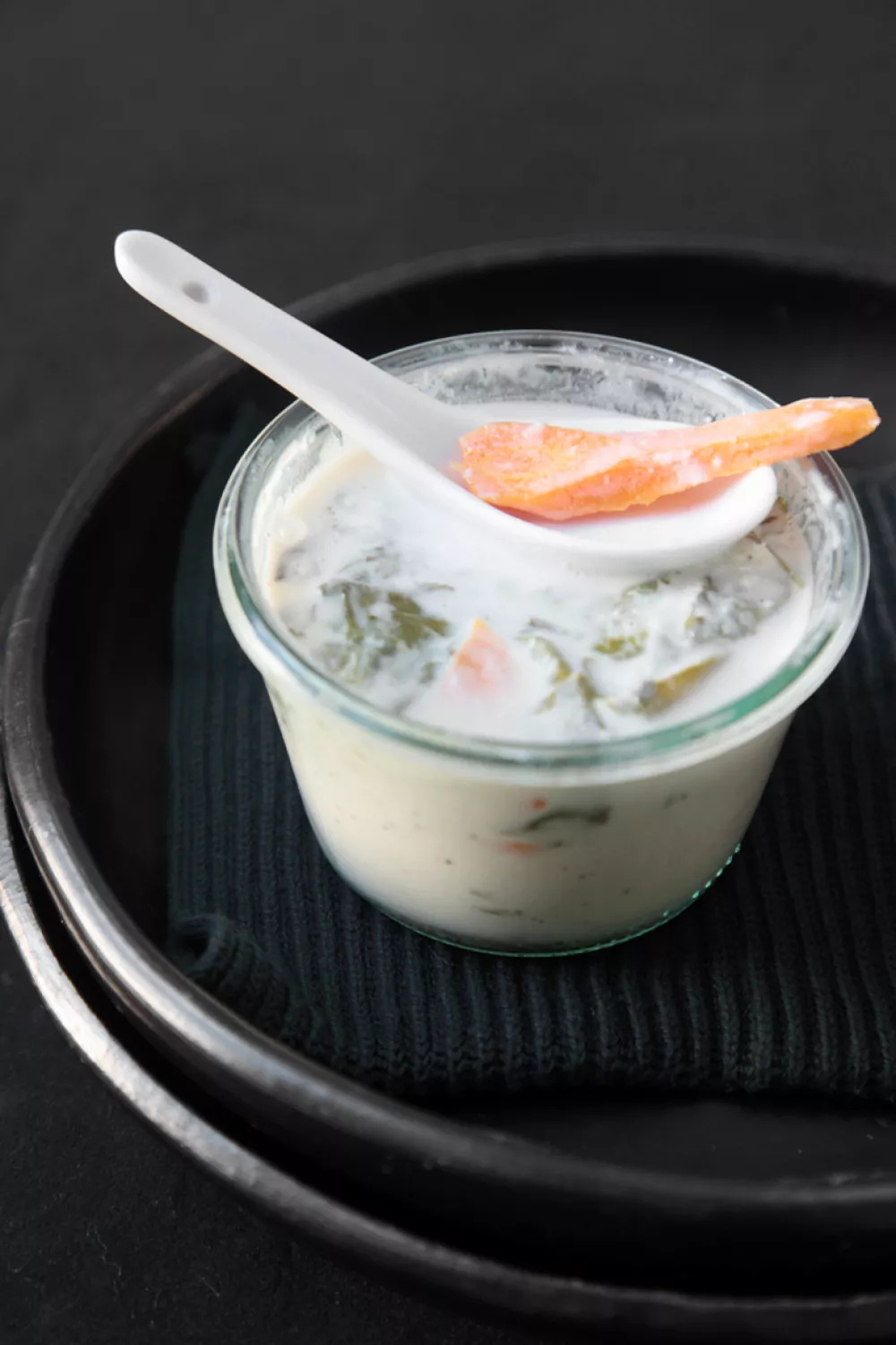 Deze romige Thaise kokossoep met kip is een Aziatische klassieker: kokosmelk en kippenbouillon trekken zachtjes met citroengras, limoenblad, gember en knoflook tot een geurige basis. Wortel en sluimererwten worden kort geblancheerd en met de kip aangestoofd voor kleur en bite, daarna gezeefd en samengebracht. Perfect als lichte maaltijd of warm voorgerecht op doordeweekse dagen, van winterse avonden tot lenteavonden, afgewerkt met koriander.