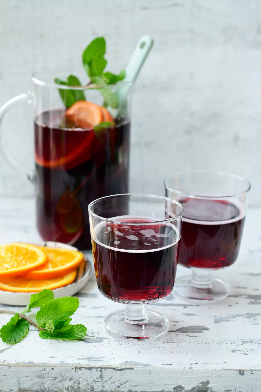 Meng het bruiswater samen met de rode wijn in een kan. Voeg de schijfjes sinaasppel en takjes munt toe en roer door. Verdeel de tinto de Verano over de glazen en serveer.