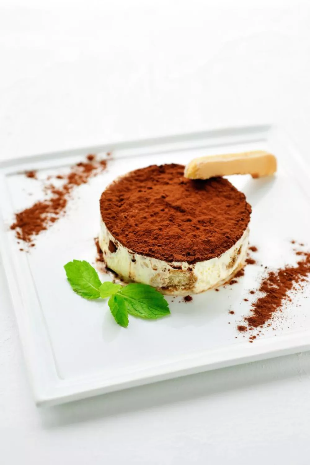 Bestrooi de tiramisu net voor het serveren met flink wat cacaopoeder.