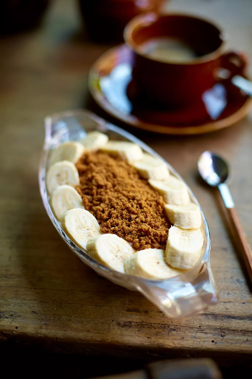 Dompel de speculaas even in de koffie en leg ze in een laagje op de crème. Dan enkele schijfjes banaan, daarop weer een laagje crème en daarop weer een laagje in koffie gedrenkte speculaas, en ga zo door tot alle ingrediënten opgebruikt zijn. Crumble de rest van de speculaas en eindig het dessert met schijfjes banaan en de speculaascrumble.
