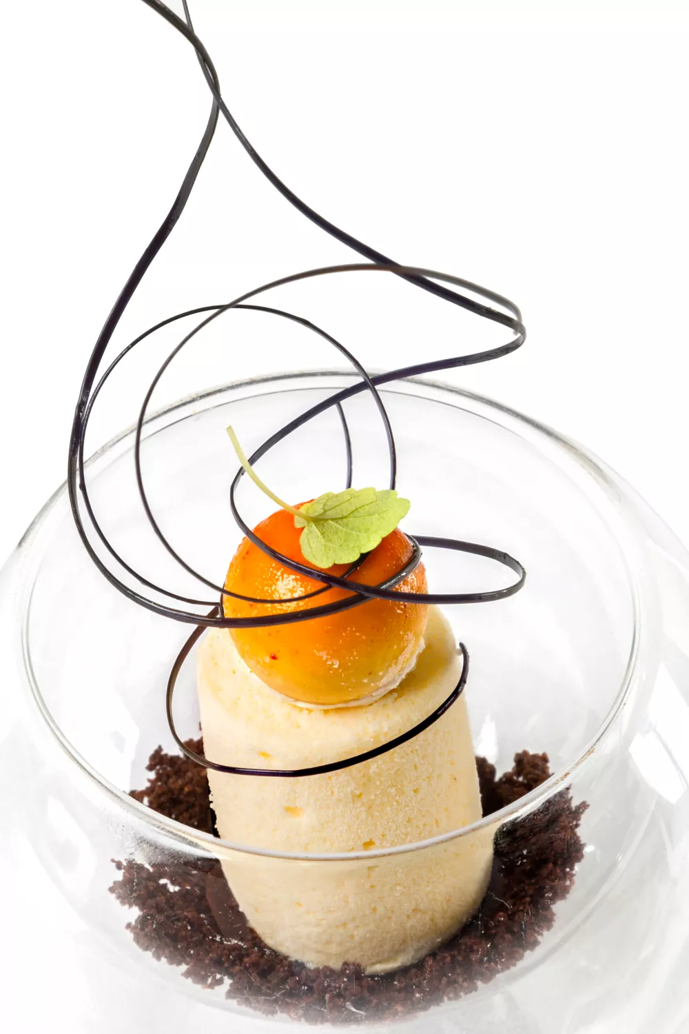 Verwarm de room, eigelen, suiker en de vanille in een pannetje al roerend tot 85°C.Voeg er de geweekte, uitgeknepen gelatine bij. Roer het mooi glad.Voeg 22 gram gemalen koffie toe en vermeng dit. Laat afkoelen.