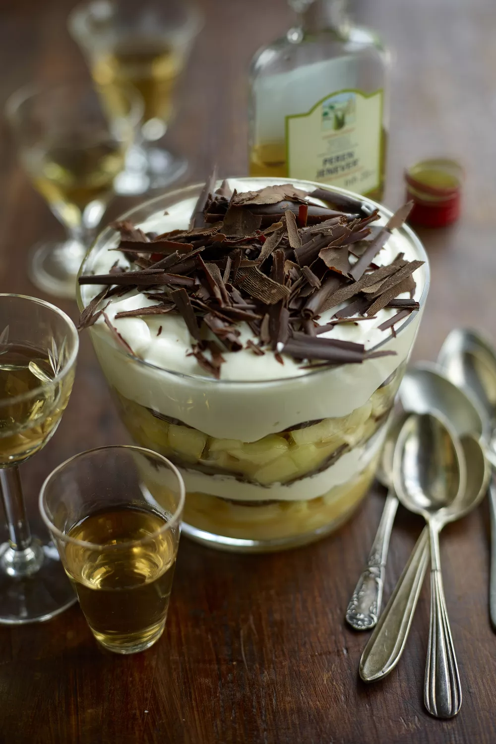 Neem enkele glaasjes en bedek de bodem met de perenadvocaatmengeling. Leg daarna enkele koekjes in koffie gedompeld, dan een beetje mascarpone. Herhaal dit tot het glaasje vol is. Werk af met chocoladeschilfers.