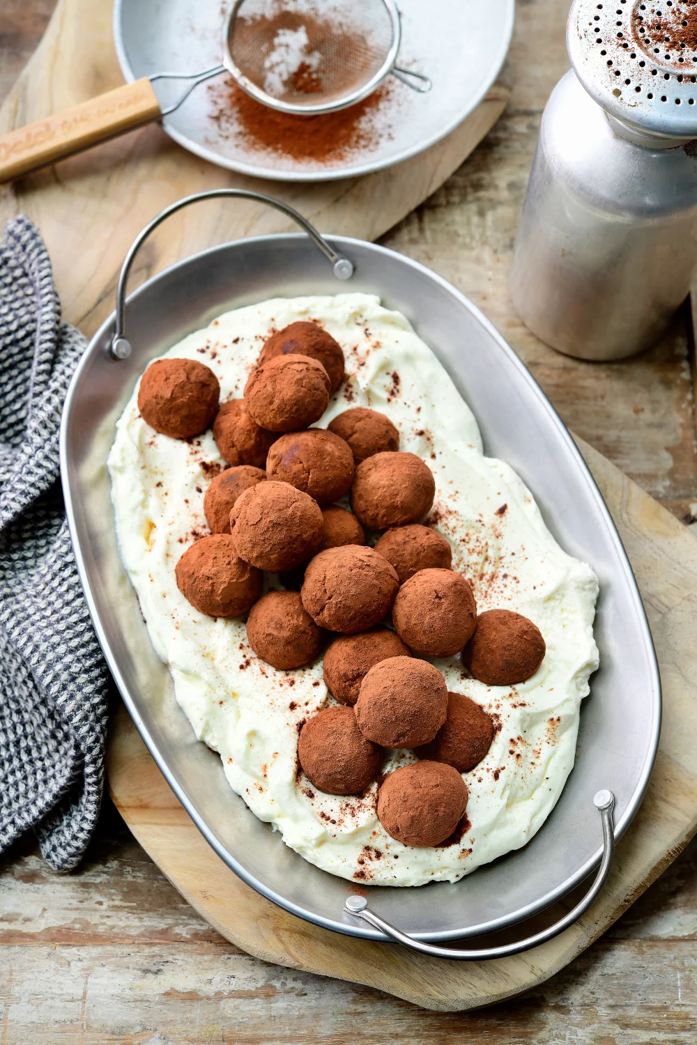 Serveer de tiramisu balletjes met de mascarponecrème als dip.