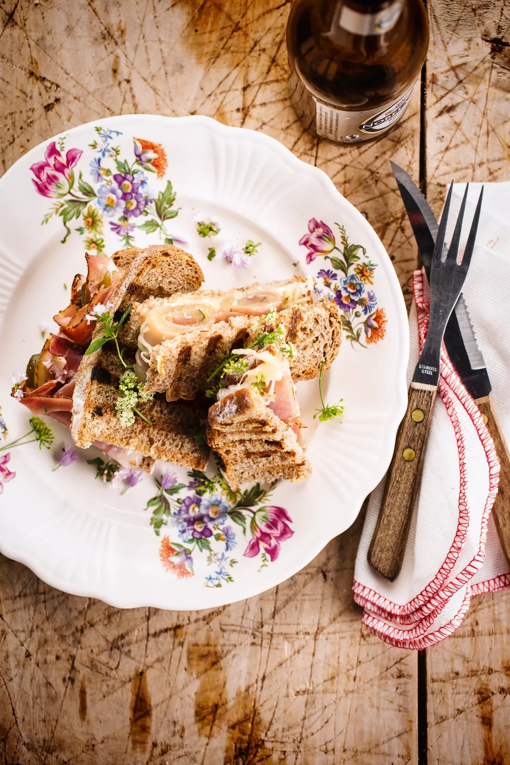 De combinatie van zuur bruin brood, Schinkenspek en Alpenkaas bereidt je voor op een stevige wandeling!