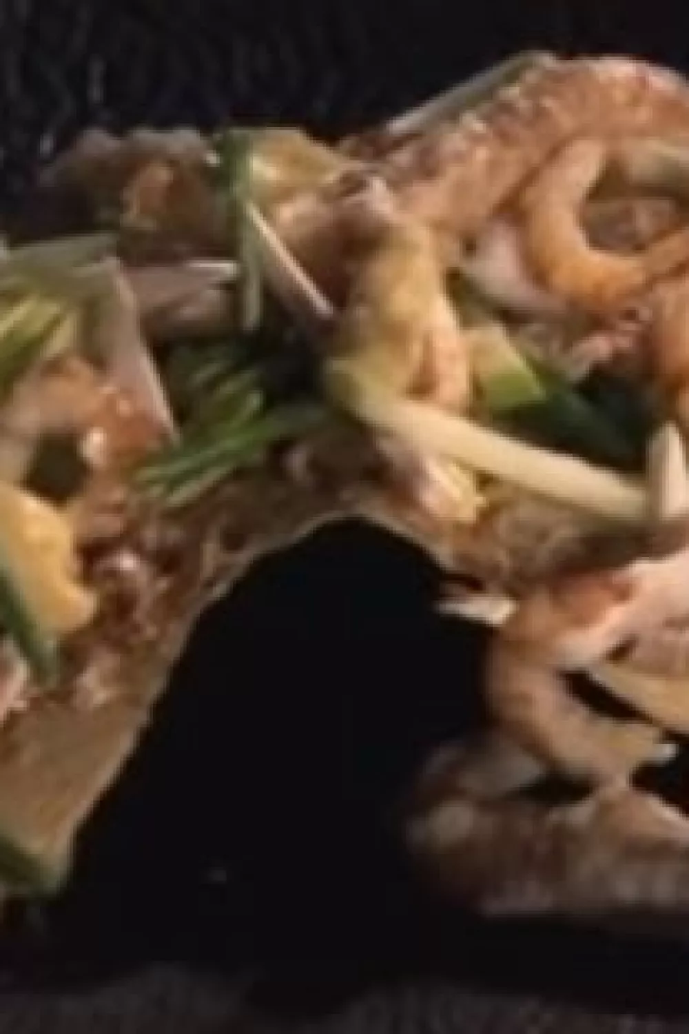 Breek een stuk van de garnalentoast af en leg op een bord. Bestrooi met de sla, de zeekraal, de champignons, de appel en de lente-ui. Leg er enkele vers gepelde garnalen en de tempura van garnalen rond. Werk af met de garnaalmayonaise.