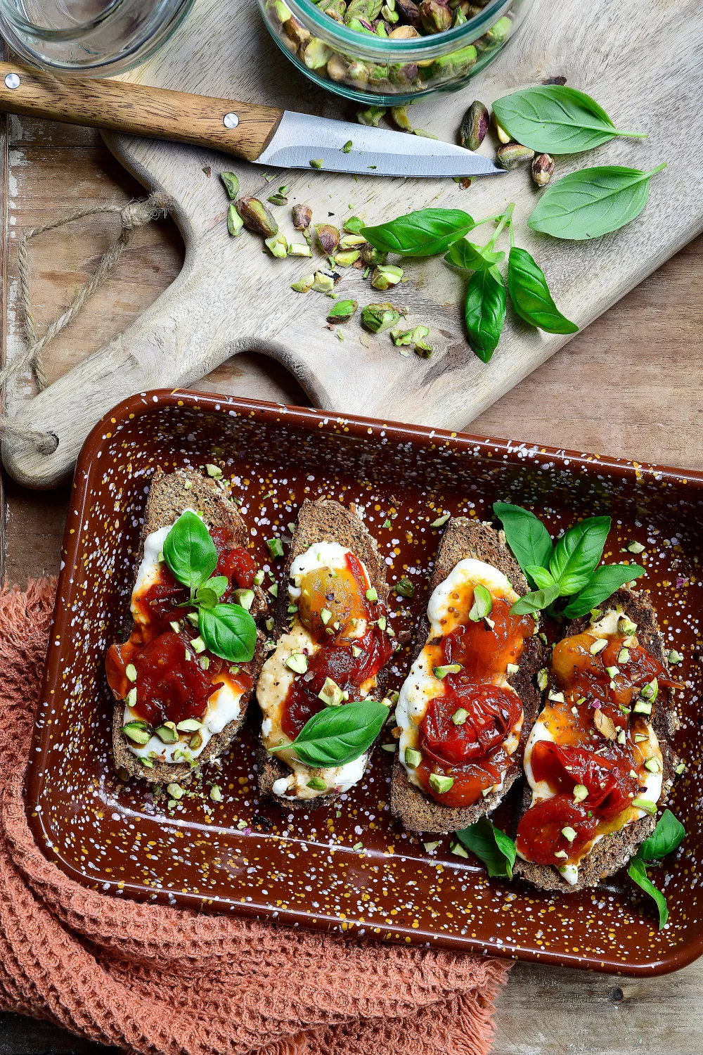 Stappenplan om recept “Toast met straciatella, tomatencompote en pistache” te bereiden