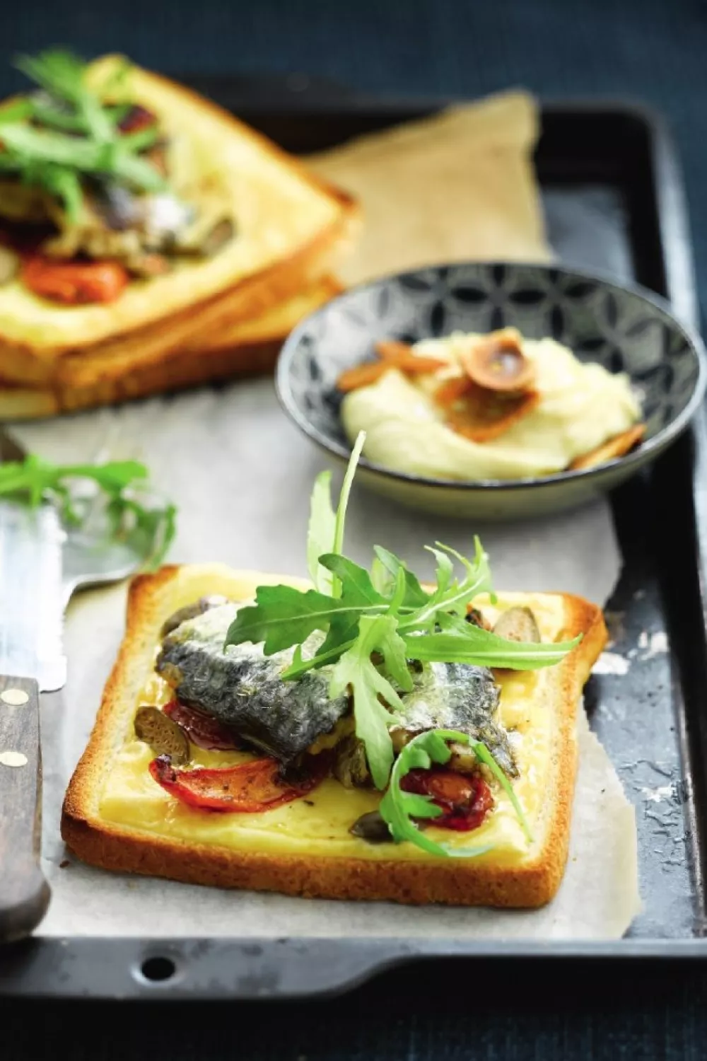 Een knapperige toast met sardienen, zongedroogde tomaat, kappertjes en smeltende jonge kaas, afgewerkt met pittige raketsla en huisgemaakte aïoli. De romige aïoli maak je snel door ei, mosterd, citroen en olie tot mayonaise te mixen, waarna de belegdjes kort onder de grill gaan voor kleur en extra smaak. Perfect als zomerse borrelhap of snelle lunch met mediterrane accenten.