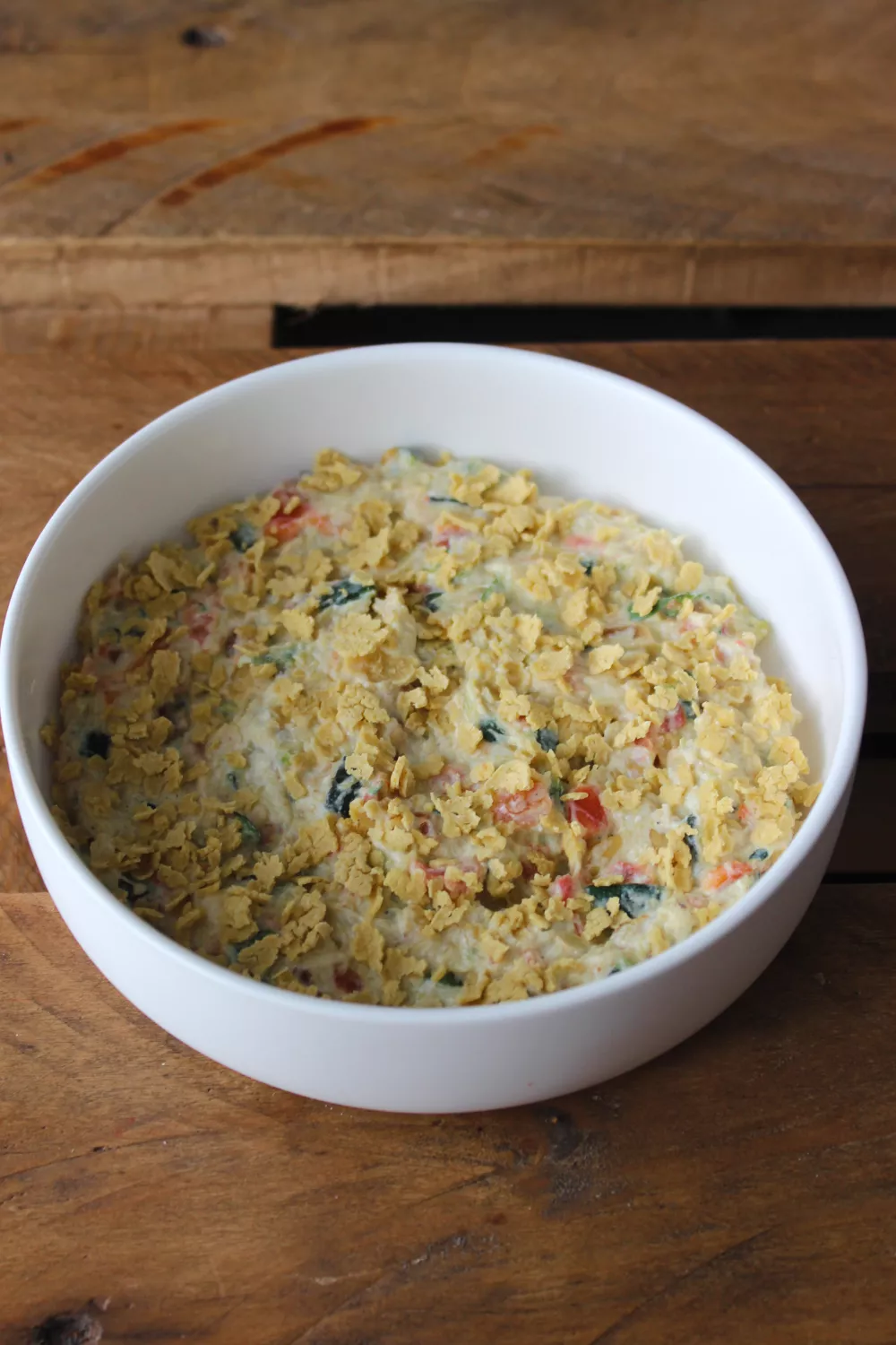 Haal de krokantjes van kikkererwt uit de oven en breek in kleine stukjes. Schep de courgettekaviaar in een schaaltje en strooi de krokante stukjes er over.