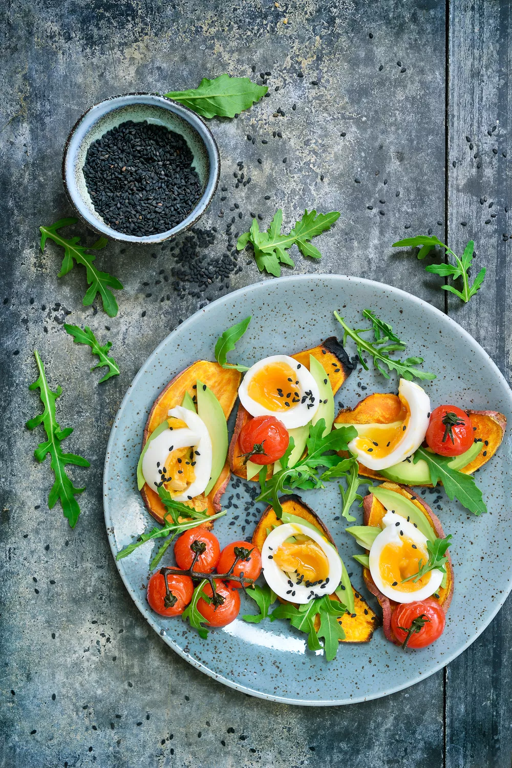 Leg op ieder plakje geroosterde zoete aardappel enkele plakjes avocado en enkele plakjes zachtgekookt ei. Werk af met blaadjes rucola, de honingtomaatjes en wat sesamzaadjes.