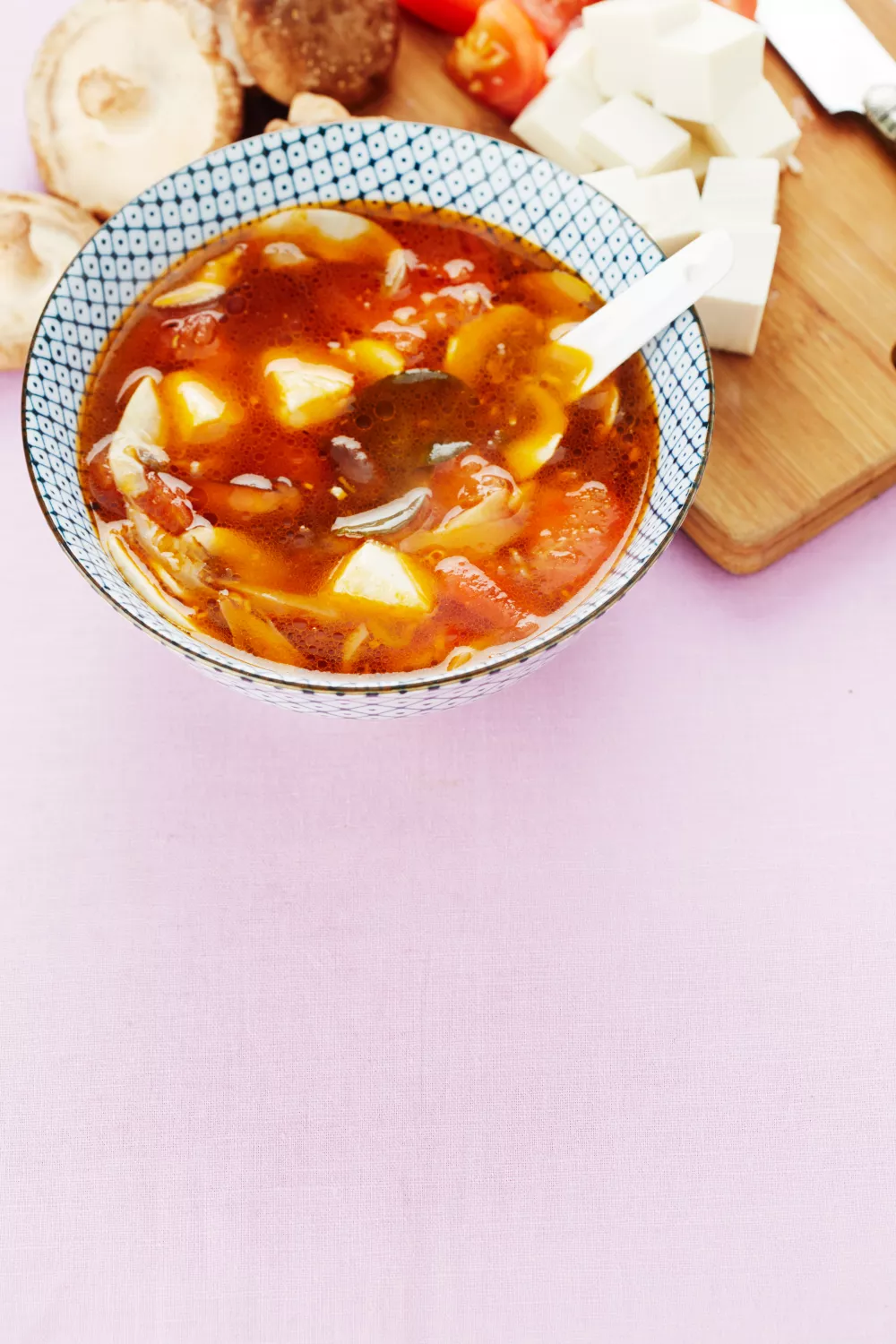 Deze lichte, geurige tofusoep met shiitake, oesterzwam en citroengras combineert frisse tomaat met hartige umami van vissaus voor een zacht Aziatisch smaakpalet. Gebakken blokjes tofu en gestoofde aromaten geven textuur en diepte, ideaal als snelle doordeweekse lunch of verwarmend gerecht voor herfst en voorjaar.