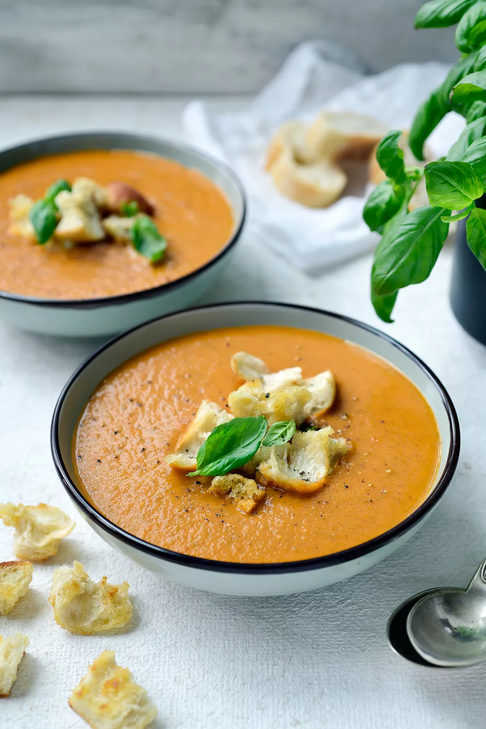 Dien de soep op en werk af met de ciabattacroutons.