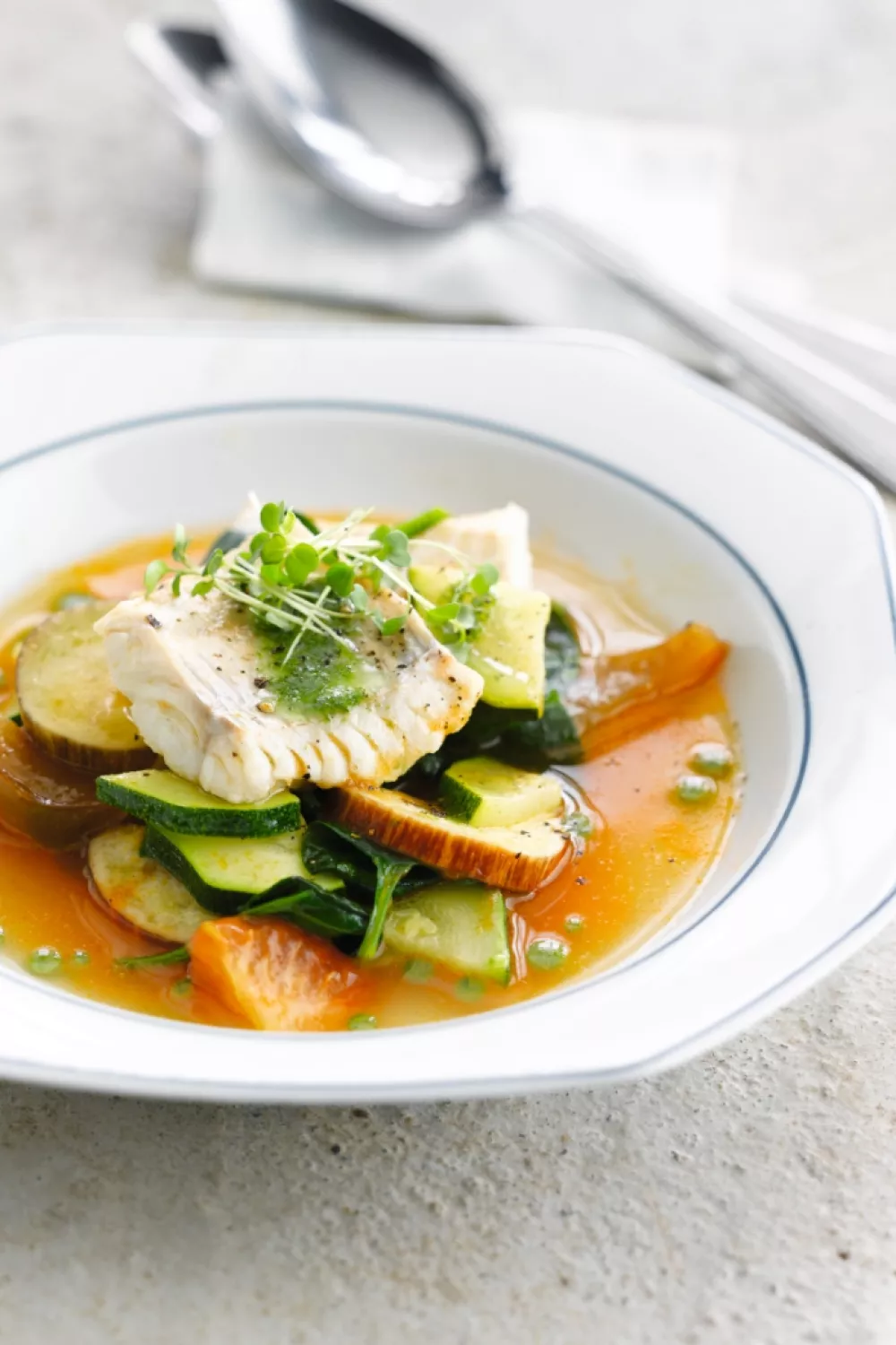 Een geurige tomatenbouillon met zachte, in de groentebouillon gepocheerde witte vis en gestoofde zomerse groenten. De soep brengt rijpe tomaten, courgette, aubergine en babyspinazie samen met tijm en marjolein voor een mediterraan smaakpalet en een lichte, gezonde maaltijd. Werk af met een frisse basilicumolie voor een aromatische toets bij een familiediner of snelle doordeweekse lunch.