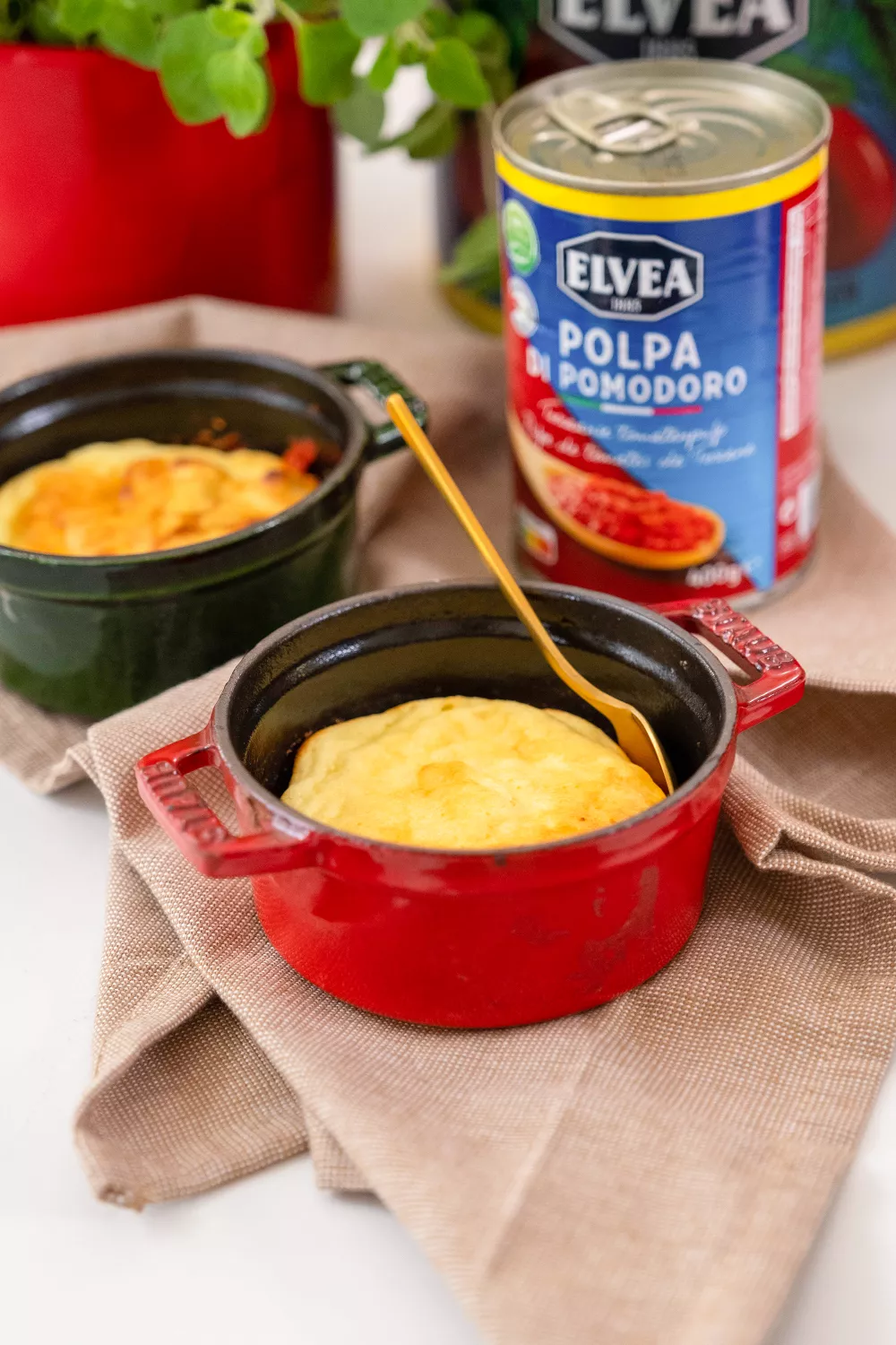 Neem twee vuurvaste ovenschaaltjes en boter ze in. Lepel op de bodem een eetlepel polpa di pomodoro en schep er het ricottamengsel over tot halverwege het potje. Zet de potjes gedurende 20 minuten in de oven alvorens te serveren.