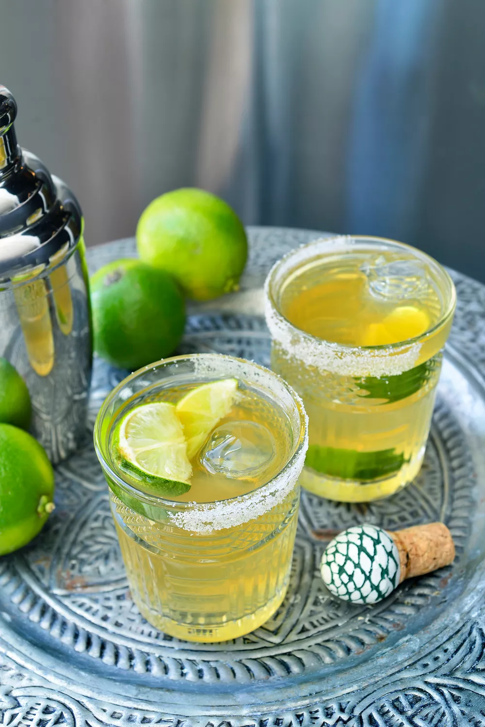 Zeef de cocktail in een tumblerglas met ijs. Garneer met een limoenpartje en halve zoutrand.