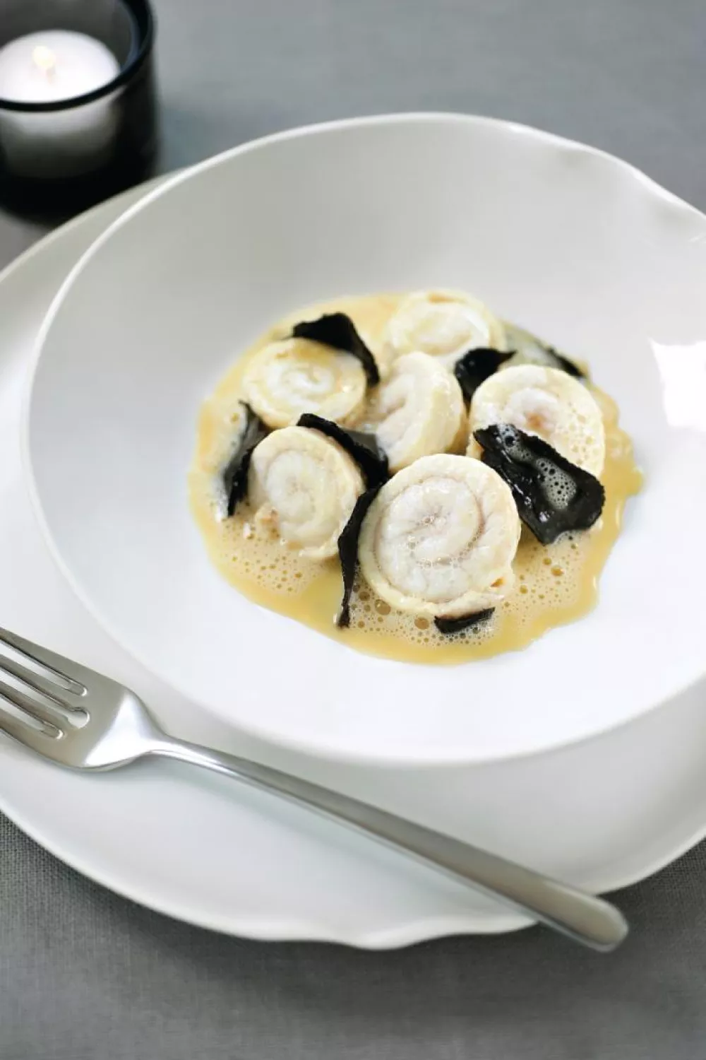 Subtiel en luxueus zijn deze zeetongrolletjes met dun geschaafde truffel, gegaard in kalfsbouillon en afgemaakt met een romige beurre blanc. Het eenvoudige rollen van de filet en kort garen in de oven concentreert de zeesmaak en laat de truffeltonen schitteren. Serveer warm met krokant stokbrood als voorgerecht of hoofdgerecht, ideaal voor diners in lente en winter.