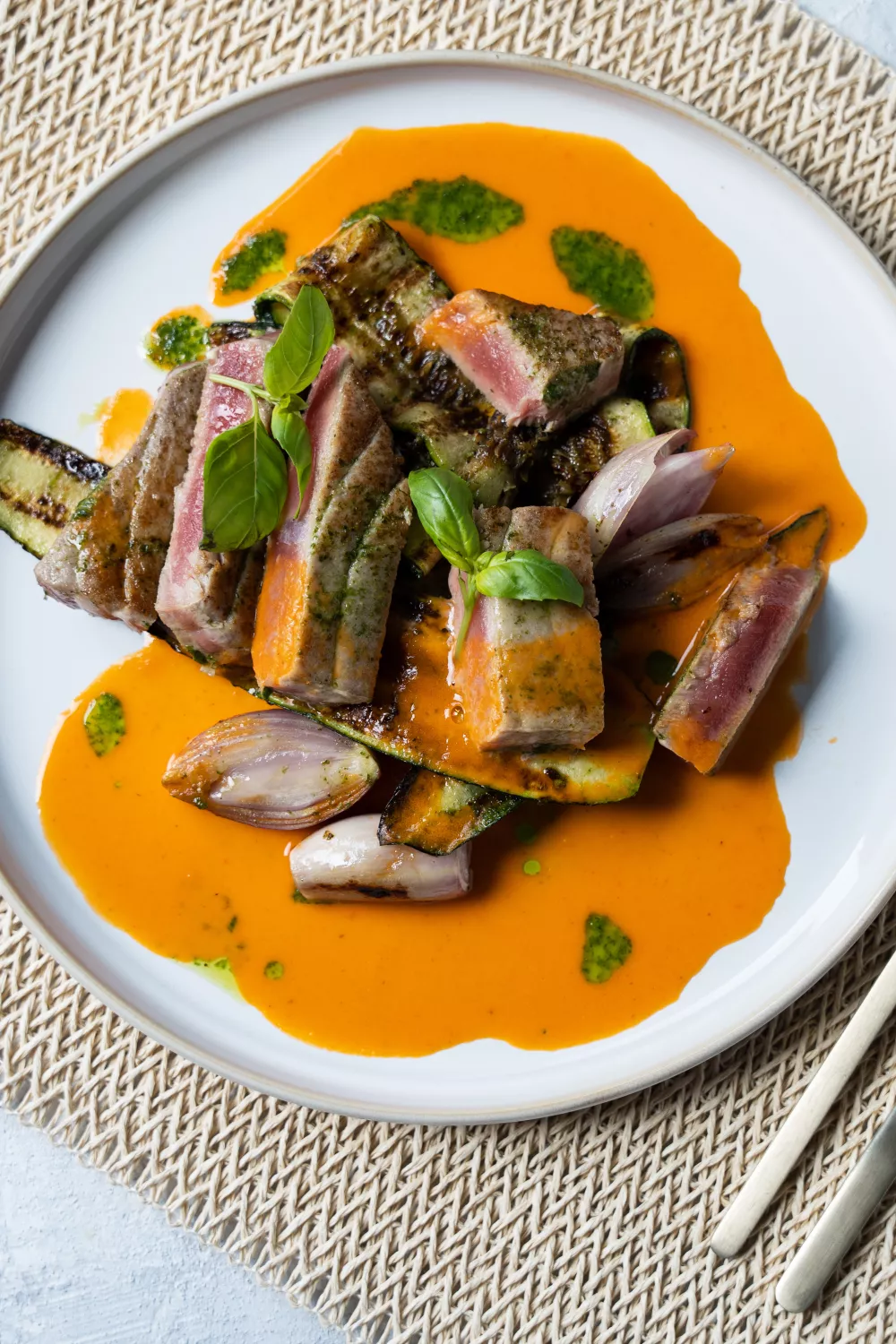 Een licht en elegant tonijngerecht met gegrilde groenten en een pittige paprikacoulis, ideaal voor zomerse avonden of een informeel diner. Sappige tonijnsteaks kort bleu gegrild en omringd door gegrilde courgette en sjalot, afgewerkt met een frisse kruidenolie van basilicum, peterselie en knoflook. De romige paprikacoulis met een scheut Sriracha geeft het gerecht een warme, pittige toets.