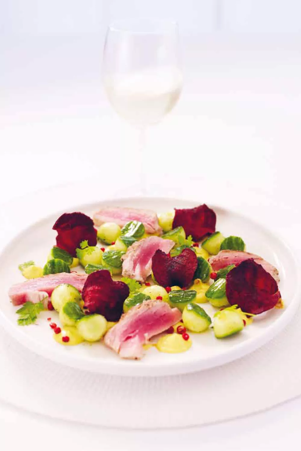 Een kleurrijk en licht gerecht met kort aangebakken verse tonijn, een zonnige pesto van gele tomaat en paprika en knapperige rode bietchips naast frisse komkommerballetjes. De pesto wordt fijn gemixt met Parmezaanse kaas, pijnboompitten en een vleugje kurkuma, de komkommer wordt met een parisiennelepel geschept voor elegante bolletjes. Ideaal als zomers voorgerecht of lichte lunch bij een glas koele witte wijn.