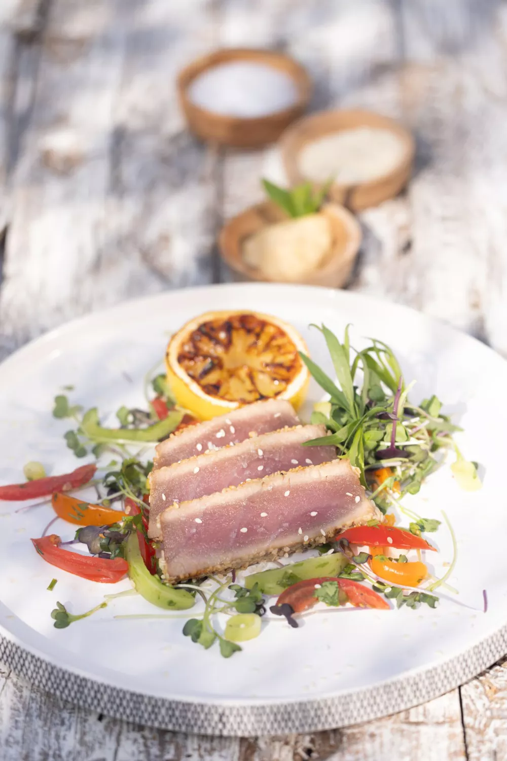 Tonijntataki met frisse ponzumayonaise en een krokante sesamkorst is een licht, zomers visgerecht boordevol umami en citrus. De tonijn wordt kort gemarineerd en op de barbecue of plaat dichtgeschroeid tot hij nog roze vanbinnen is, daarna in sesam gerold. Serveer met een pittige Japanse salsa van kerstomaten, limoen en kruiden voor een smaakvol lunch- of dinermoment.