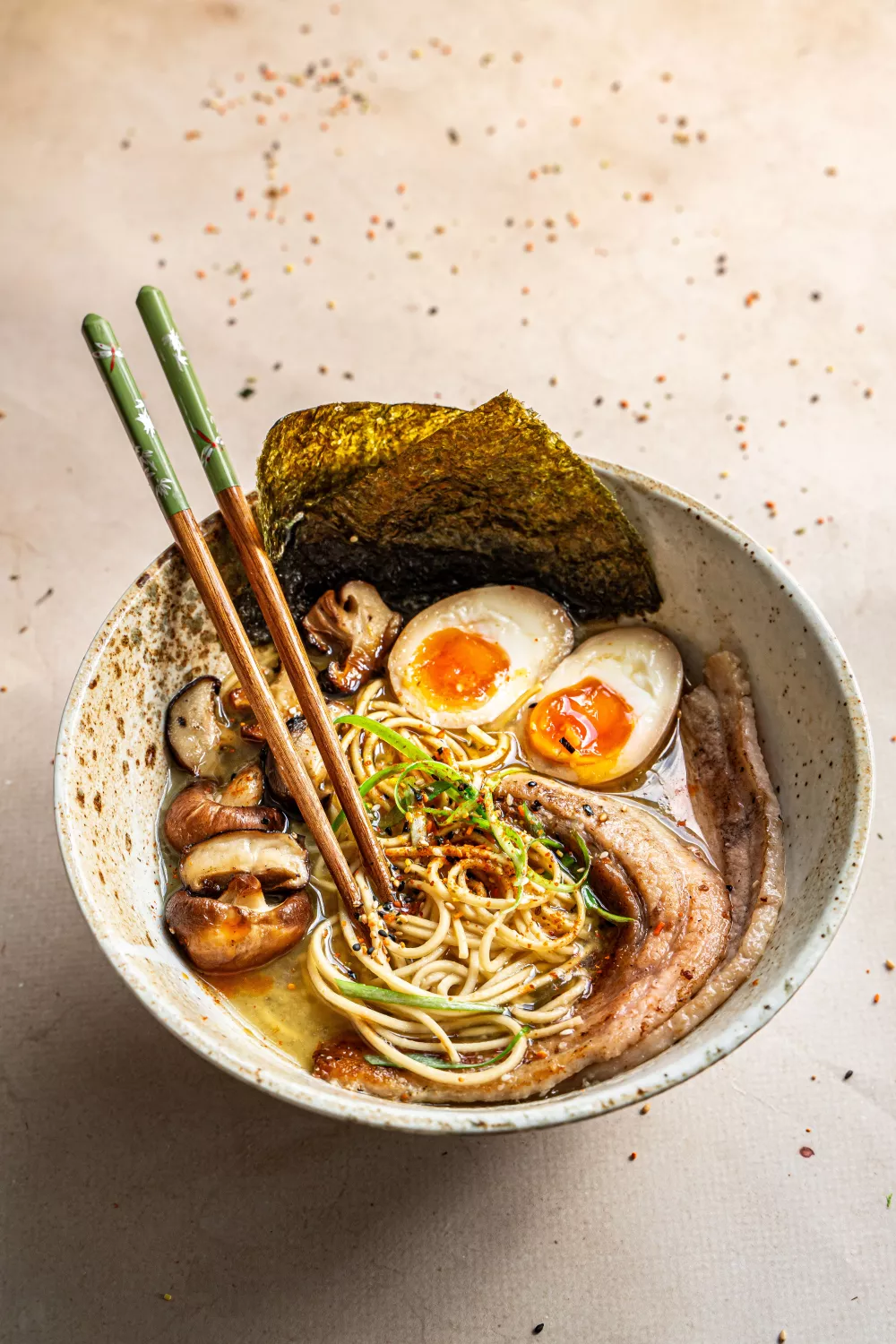 Romige tonkotsu stijl ramen met krokant buikspek en umami van shiitake en dashi bieden verwarmend comfort. De rijke bouillon van varkensvet, kippenbouillon en dashi wordt met de staafmixer gladgemaakt en vormt samen met sojagemarineerde eitjes, ramen noedels en tsuyu de smaakvolle basis. Perfect voor koude avonden of een gezellige maaltijd waarbij marineren, pureren en bakken zorgen voor diepe, hartige smaken.